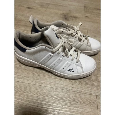 Adidas Stan Smith low top sneakers in white leather with classic navy blue accents. These shoes feature the iconic perforated three-stripe design on the sides and the signature Stan Smith branding on the tongue. The durable rubber outsoles provide excellent traction, while the padded collar ensures comfort for everyday wear. A timeless athletic silhouette that pairs well with casual or sporty outfits. Note some visible wear on the toe boxes and outsoles as pictured.