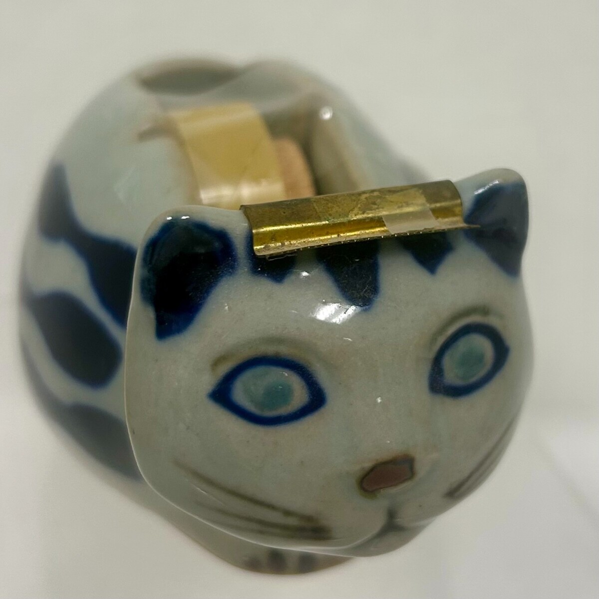 Vintage Takahashi Japan Ceramic Pottery Blue Laying Cat Figural Tape Dispenser. Blue ceramic pottery cat figural tape dispenser has original black and gold Takahashi sticker, measures approx. 5 1/8" long and 2 3/4" tallest point, no damage some signs of use. See pictures.