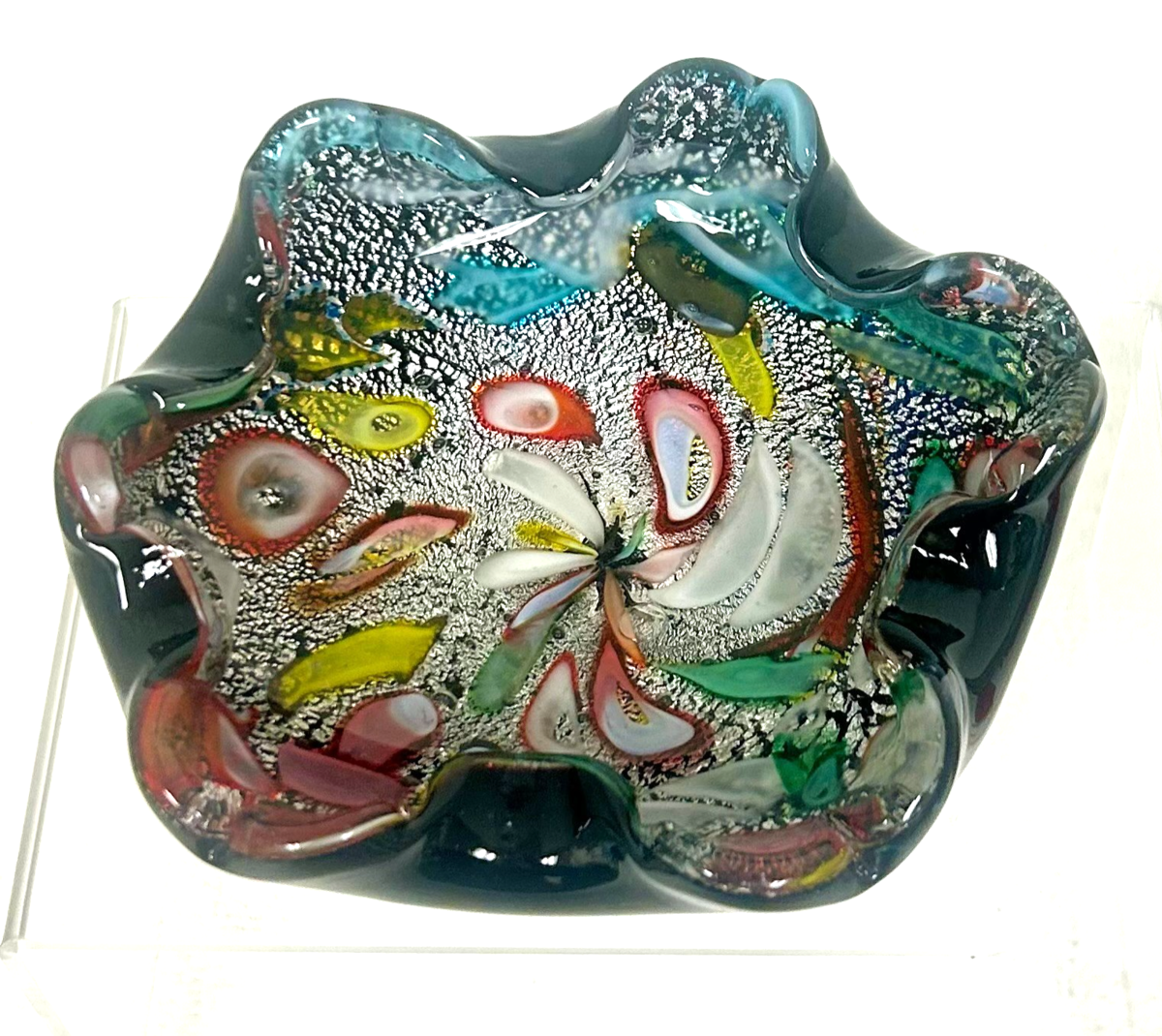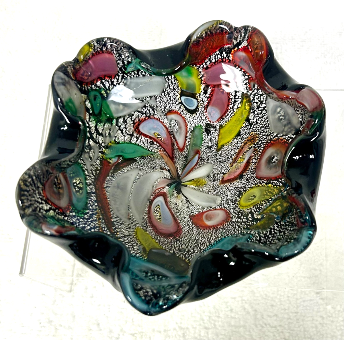 Vintage Italy Murano Tutti Frutti Confetti Silver Foil Glass Dish Red Sticker