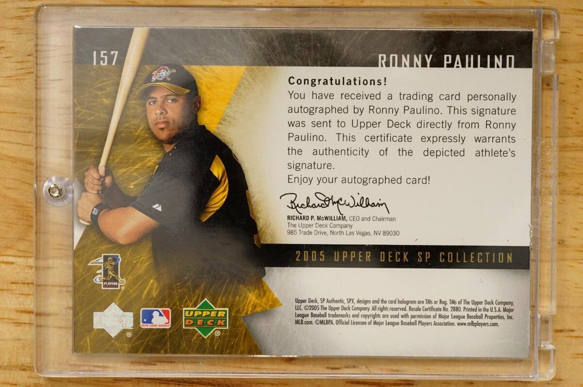 2005 Ronny Paulino #157 Autograph UD SP Pittsburgh Pirates 115/185 Catcher. You get the exact card(s) shown. Raw and ungraded. No smoke or pet odors. Present in a one touch.