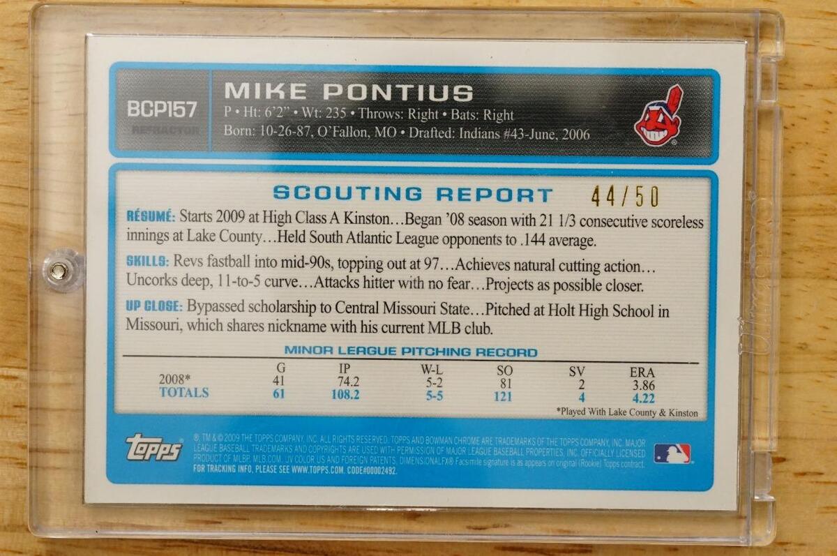 2009 Bowman Chrome Prospects Gold Refractor 44/50 Mike Pontius BCP157. You get the exact card(s) shown. Raw and ungraded. No smoke or pet odors. Present in a one touch.