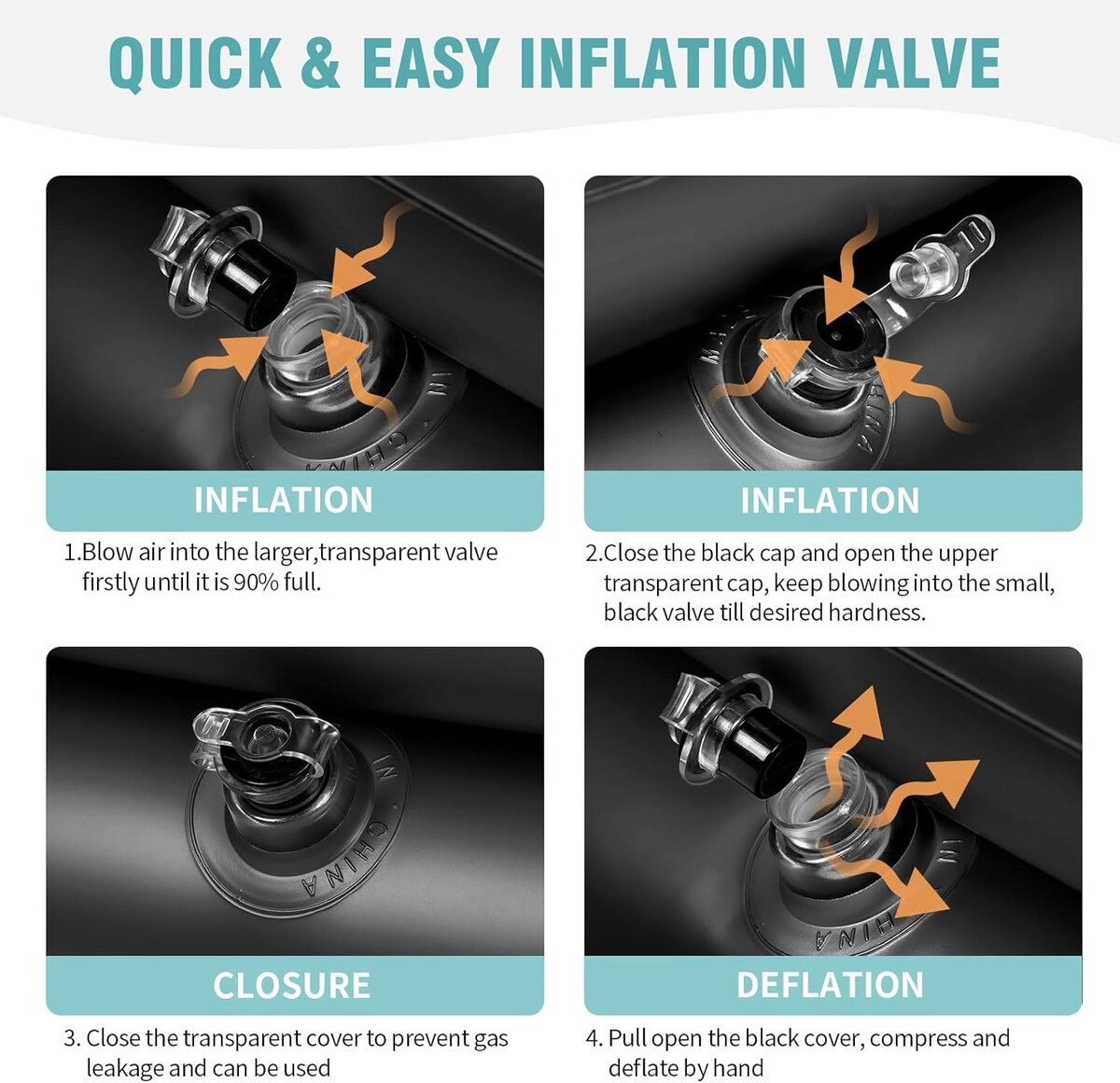 Quick inflation in under 3 minutes using dual air valves.