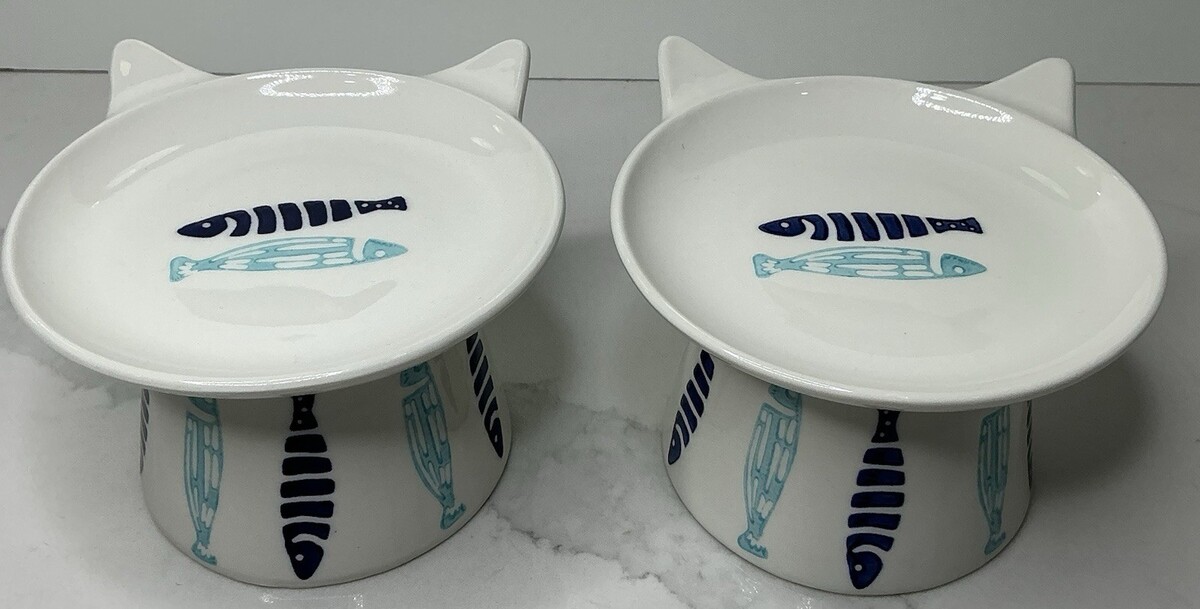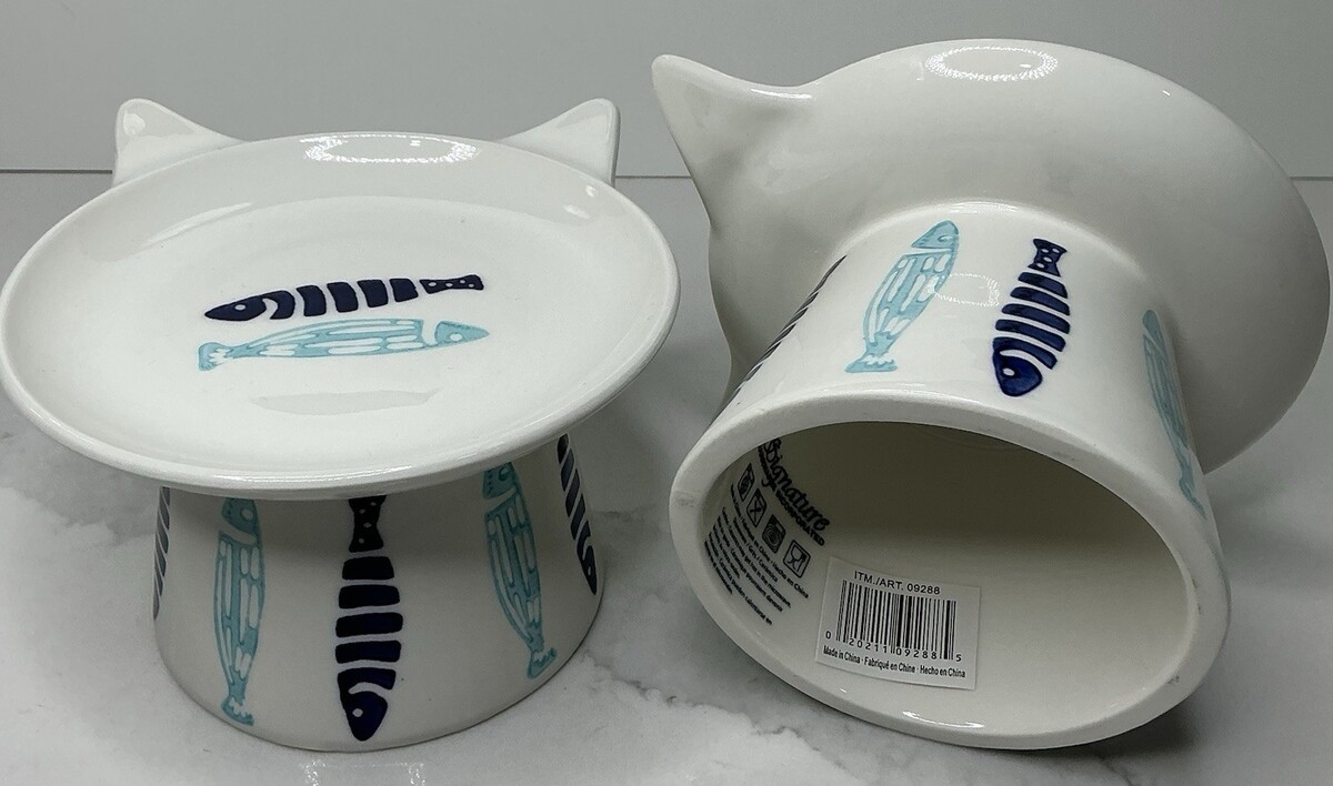 2 Signature Elevated Bowl Cat Food Blue & Aqua Ceramic Fish Design New