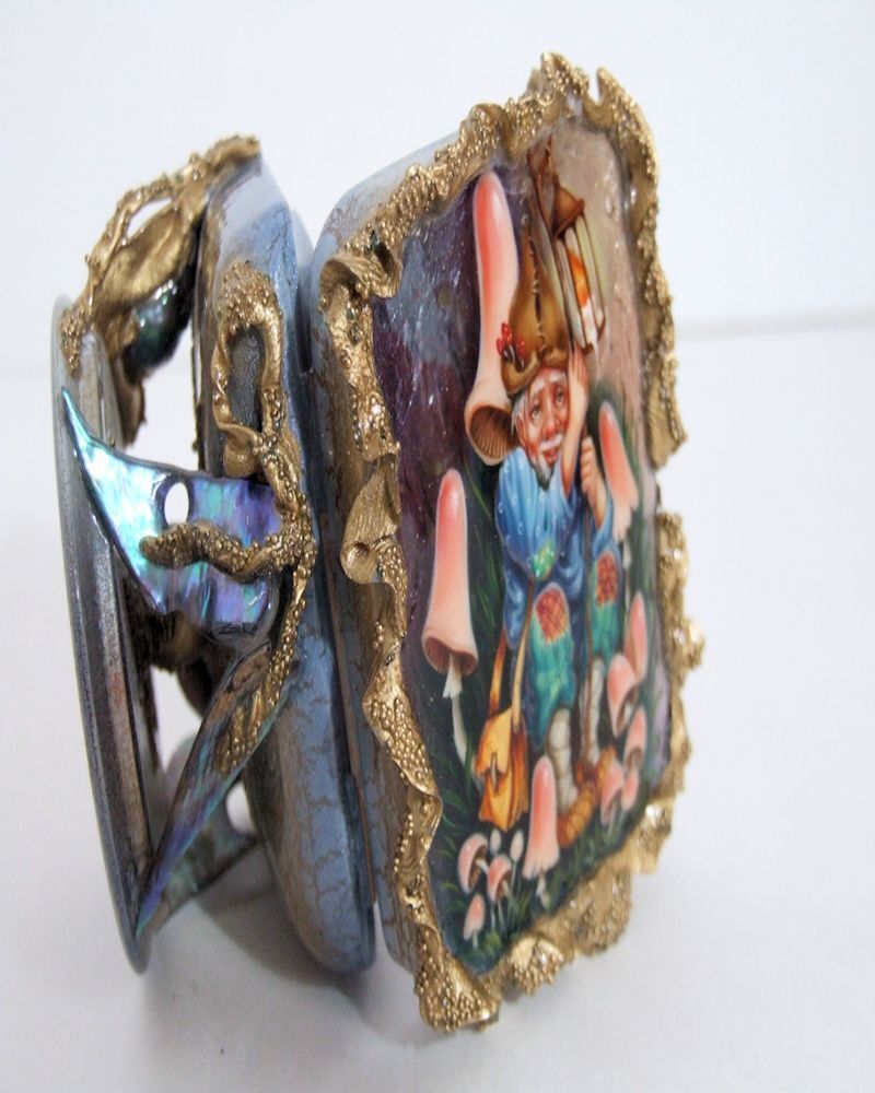 Beautiful hand painted Russian Lacquer Box by the talented artist Shenshina. She is a graduate of the Fedoskino School of Lacquer miniatures.The subject of this lacquer box is of a Forest Dwarf amongst the mushrooms with his lantern. Throughout the whole piece she has incorported real beautiful designs the box itself is made from She, also inside the lid of the box, has featued a beautiful rustic design. The size of the box is 2.5 ( 6 cm) inches tall and the box itself is 3.0 x 2.5 inches wide ( 8 x 6 x 4 cm). The box is signed by heron the inside lid of the box. This artist uses a fantastic 3D effect, the work stands out at you! Attention Europe and Asia customers please be aware standard postage can take from 7-45 business days to arrive. If you need the item faster please select anoth