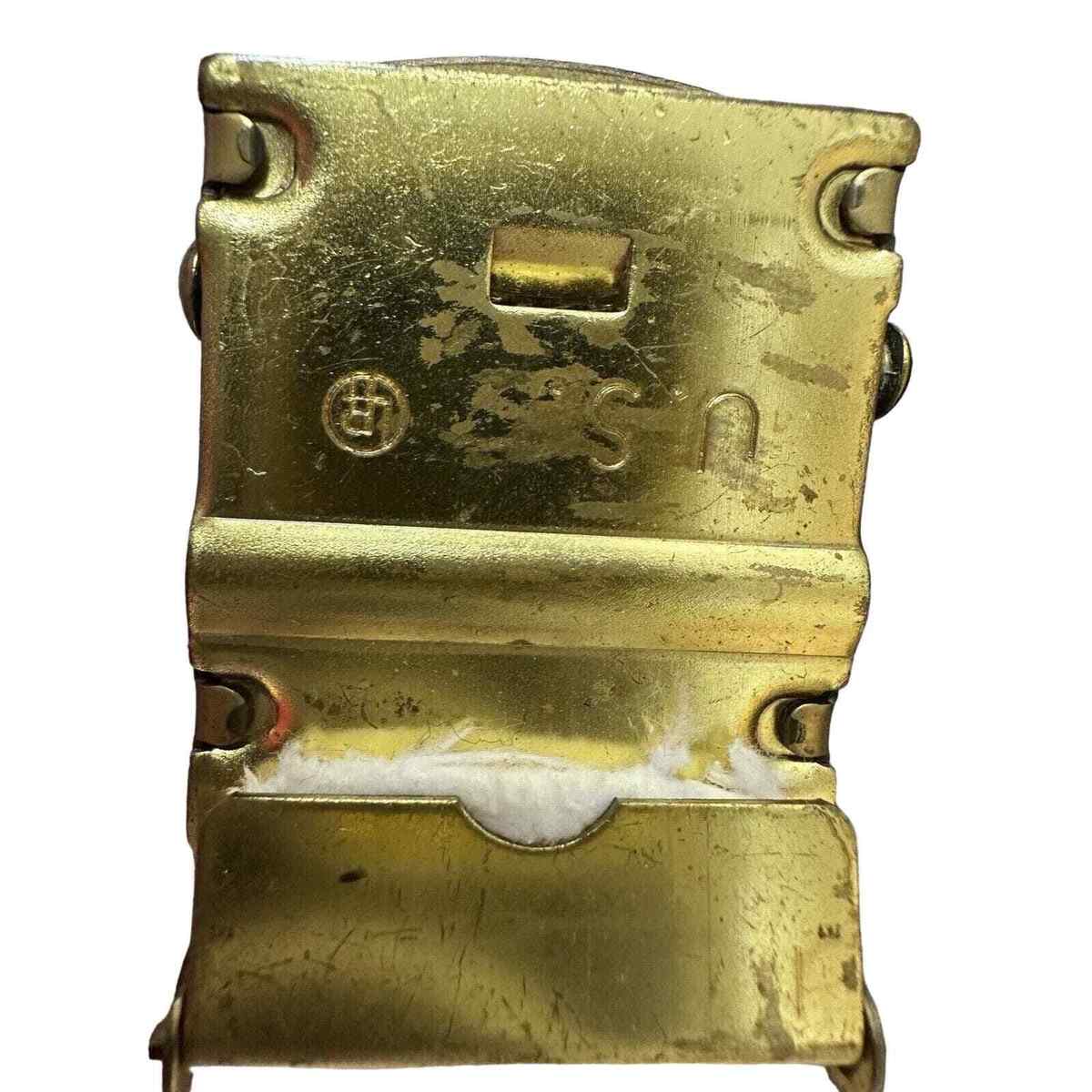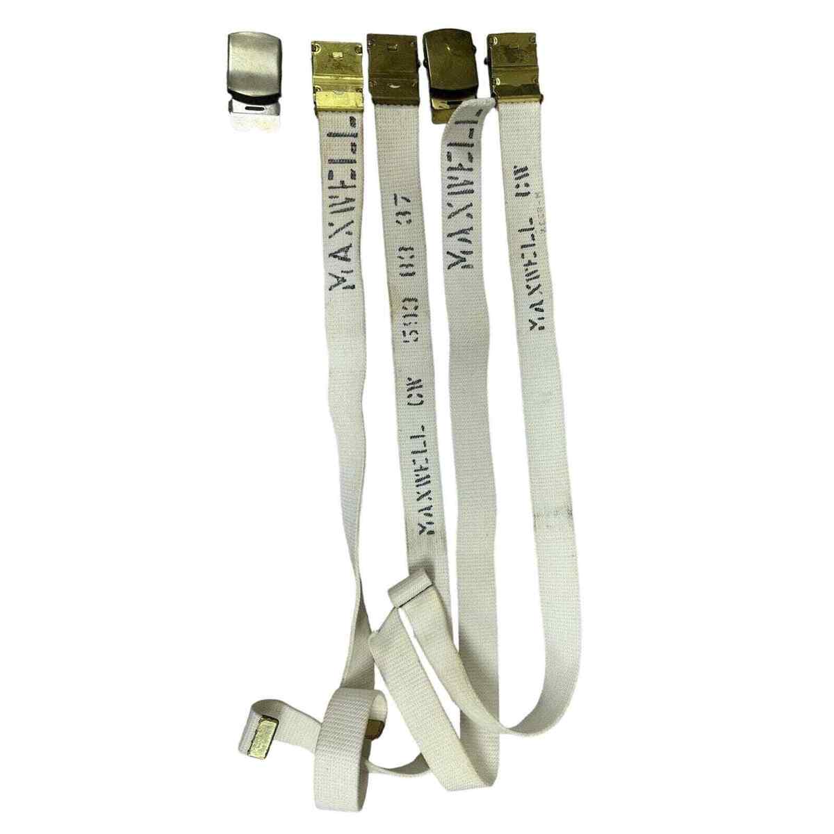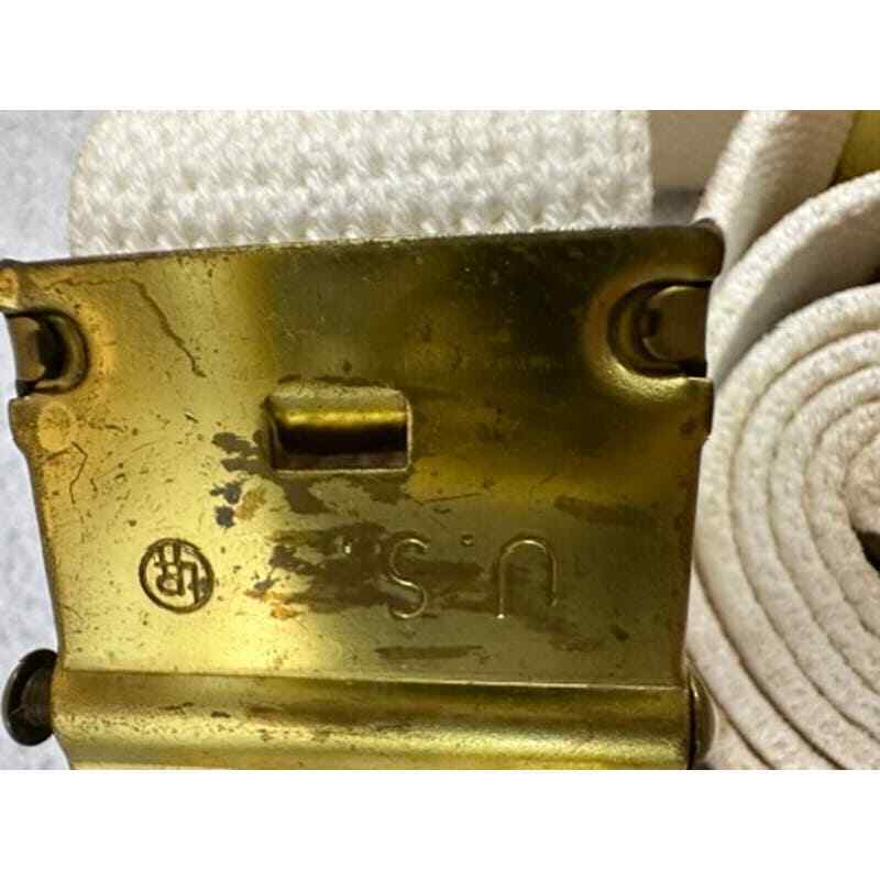 All belts are in good used condition, in white webbing with four brass buckles and one steel. Have the sailor's name stenciled on, though in different ways. The belt is 28" long without the buckle and 29.5" long with it on. The webbing is 1.5" wide.LOVE RETRO!