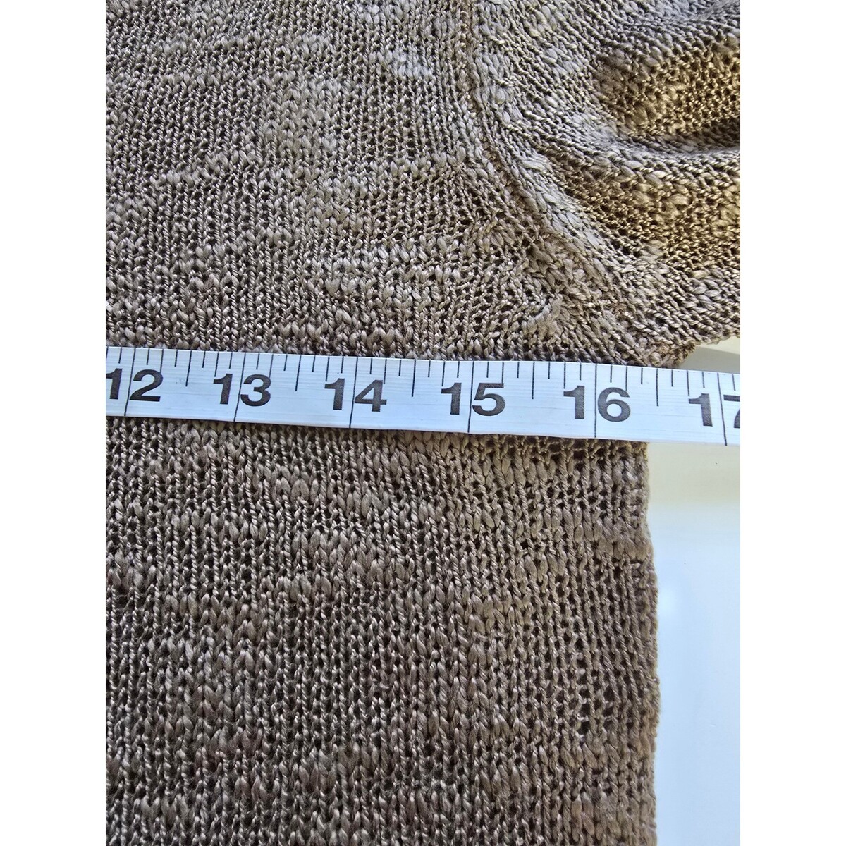Lightweight mocha-colored knit top features a flattering V-neckline and short sleeves, perfect for transitional layering. The textured acrylic-blend fabric offers a subtle sheen and a relaxed silhouette with a slightly curved hem. A versatile piece that pairs effortlessly with denim or trousers for a polished yet comfortable everyday look.