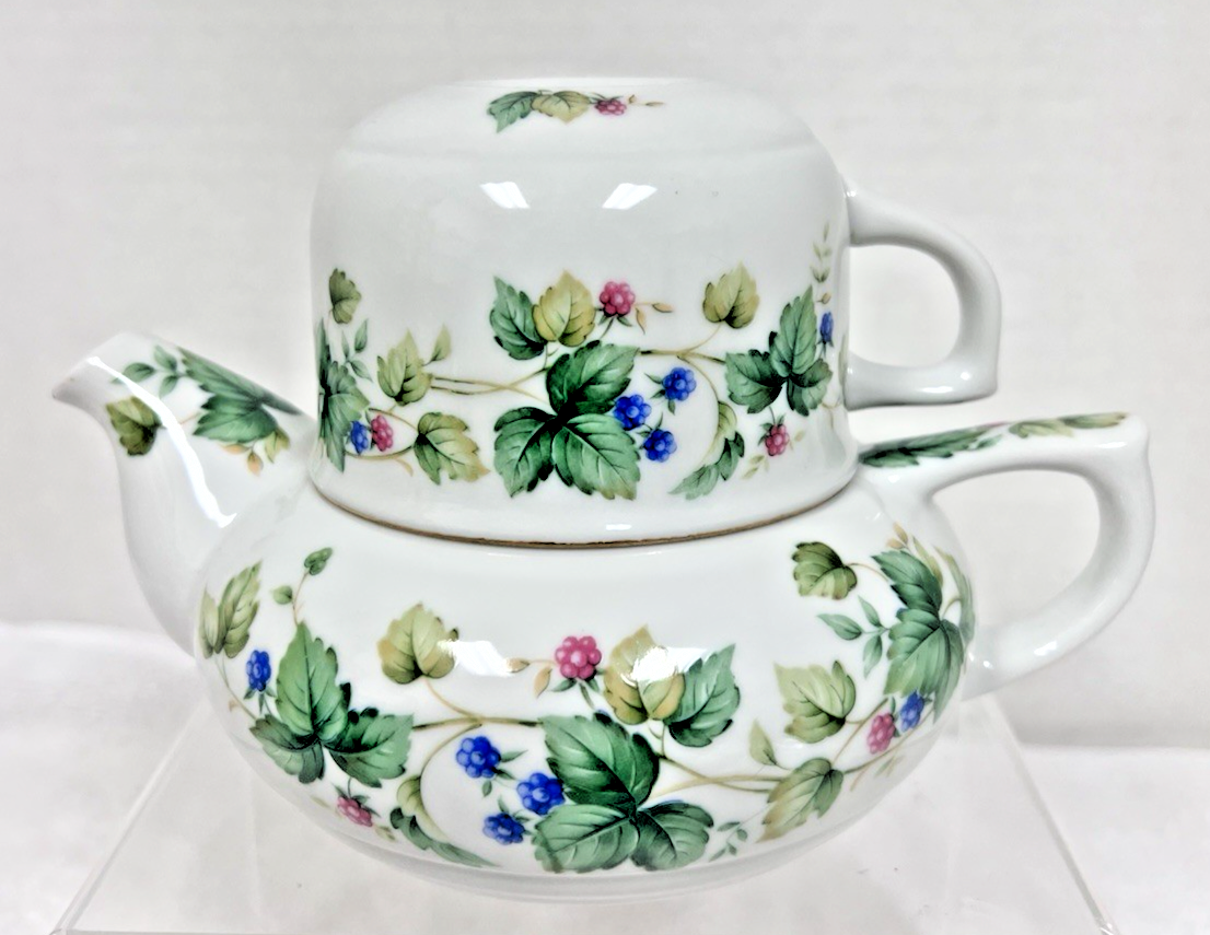 Andrea Individual 2 Cup Teapot Lid Vineyard by Sadek w Cup Berrys Flowers with the lid it is 3.5 inches tall no chips cracks or breaks
