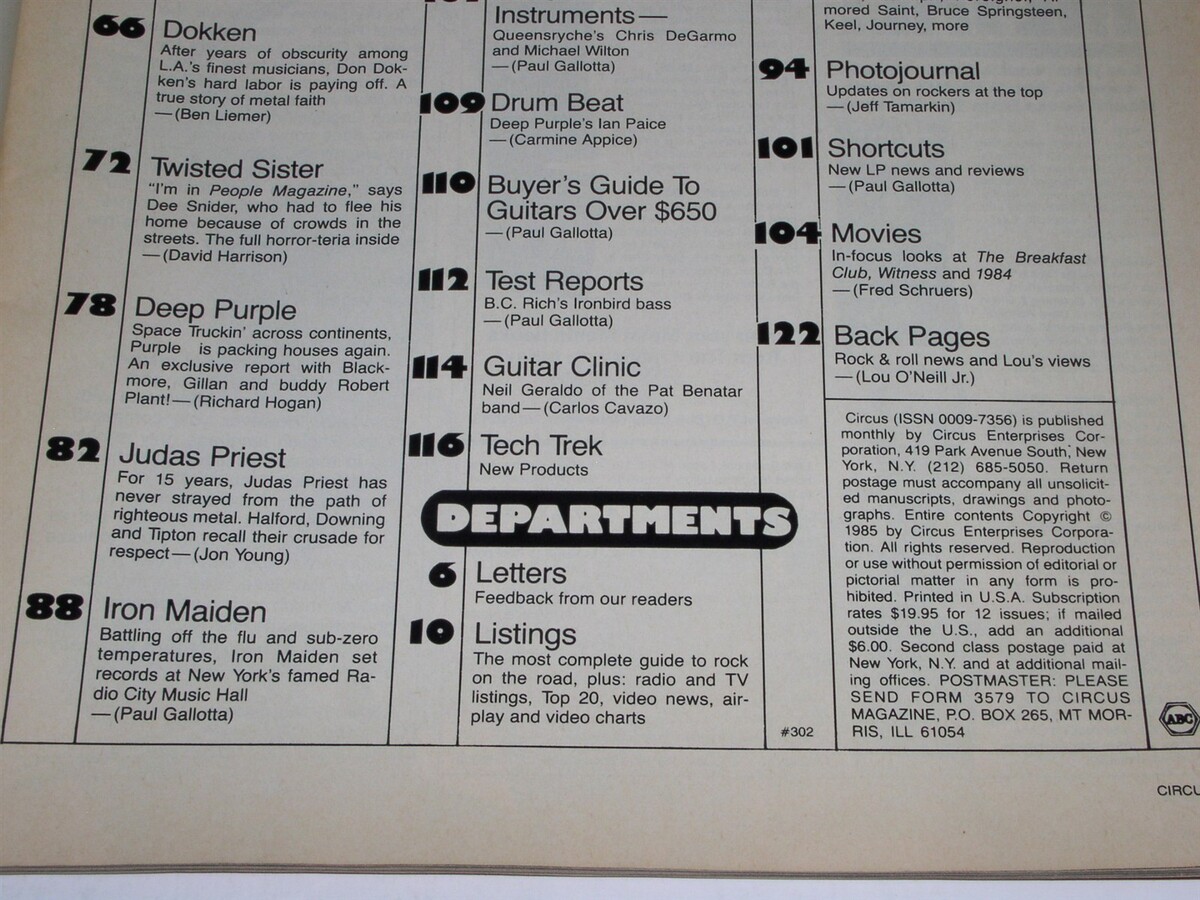 This is the April 30, 1985 issue of "Circus" magazine. Inside shorts and pics on: Motley Crue, KISS, W.A.S.P., Dokken, Iron Maiden, Deep Purple, Twisted Sister, Judas Priest centerfold. A terrific item for the fan or collector.