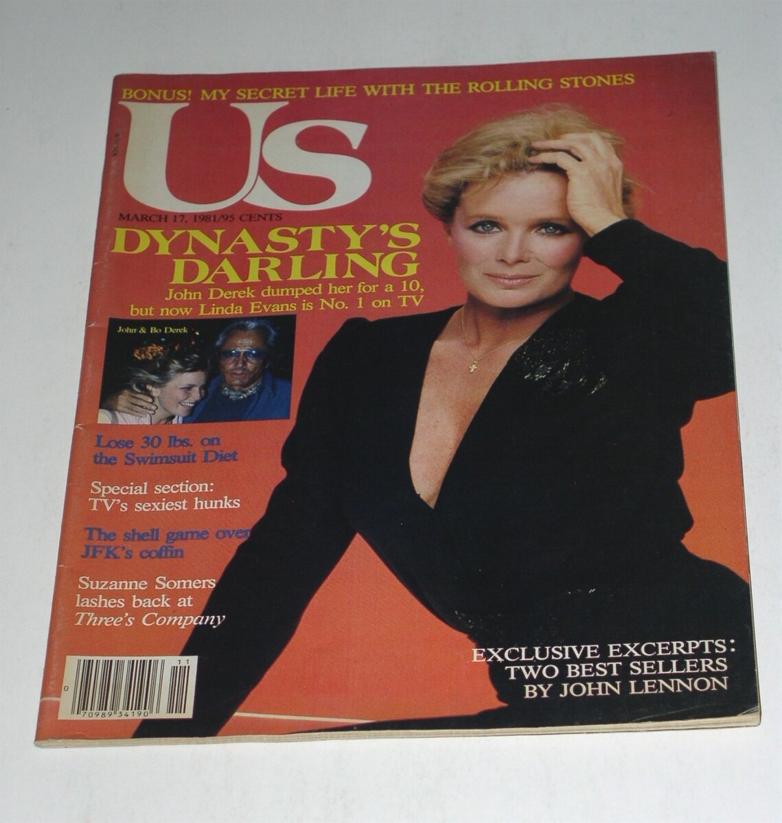 This is the March 17, 1981 issue of "Us" magazine. Cover story on Linda Evans. Inside: John Lennon, John Bo Derek, Suzanne Somers, JFK. A terrific item for the fan or collector.
