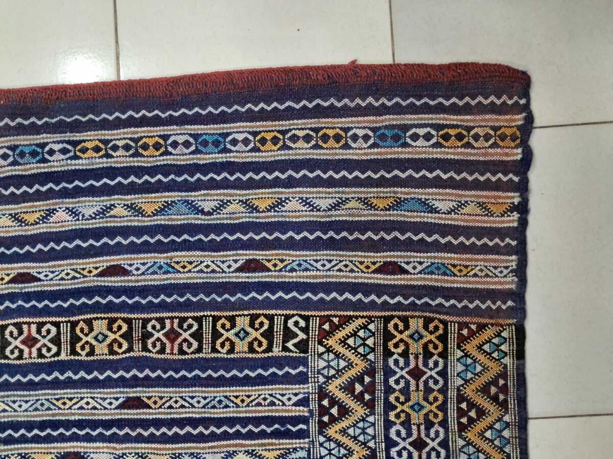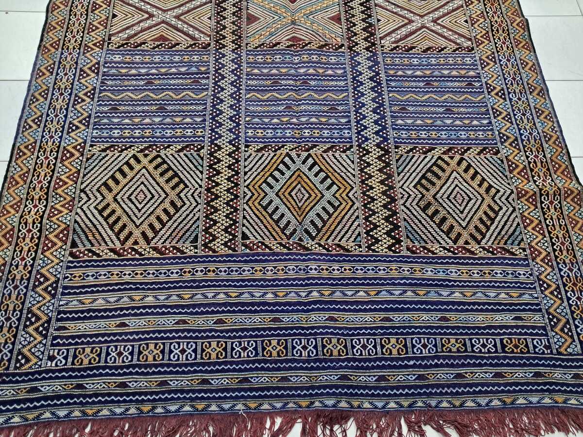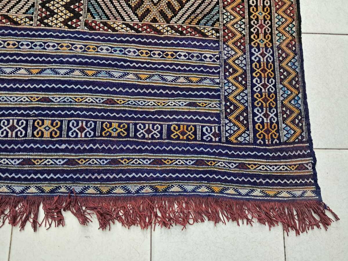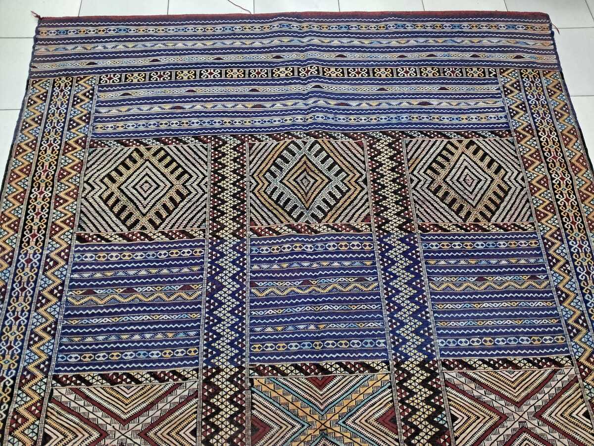 The Tiflet rug is a traditional Moroccan flat-weave textile, handcrafted by Berber artisans in the Tiflet region. Renowned for its durability and intricate designs, this rug combines various weaving techniques, including flat weaving, knotting, and embroidery, resulting in a dense, scratch-resistant surface.