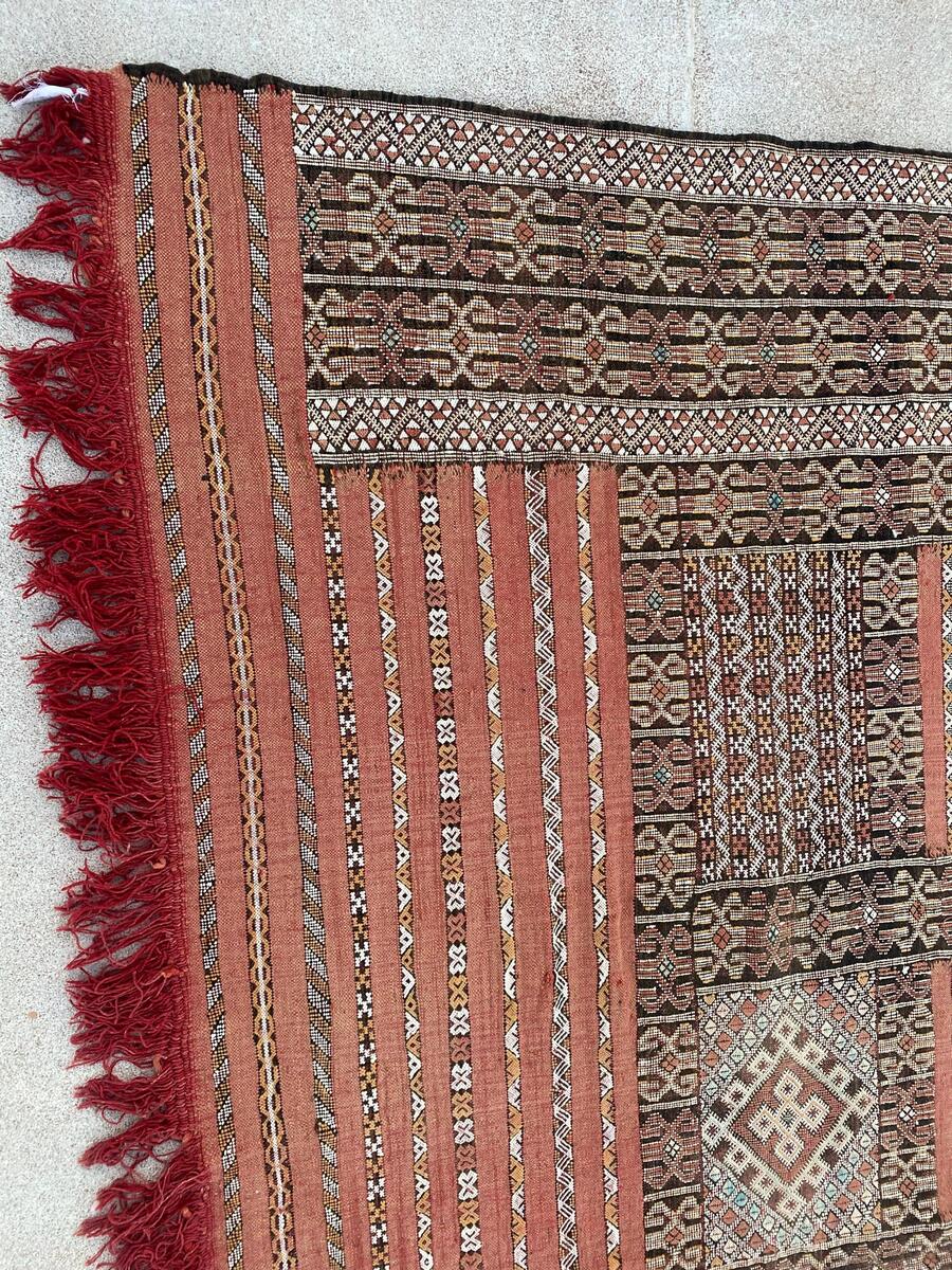 The Tiflet rug is a traditional Moroccan flat-weave textile, handcrafted by Berber artisans in the Tiflet region. Renowned for its durability and intricate designs, this rug combines various weaving techniques, including flat weaving, knotting, and embroidery, resulting in a dense, scratch-resistant surface.