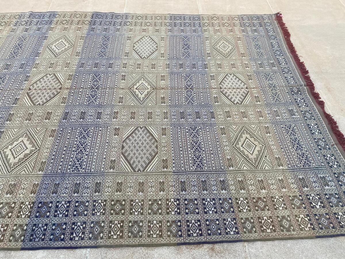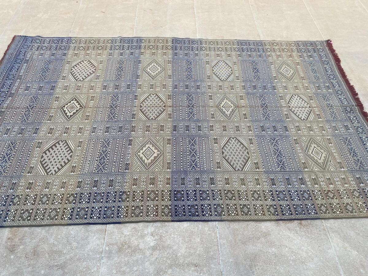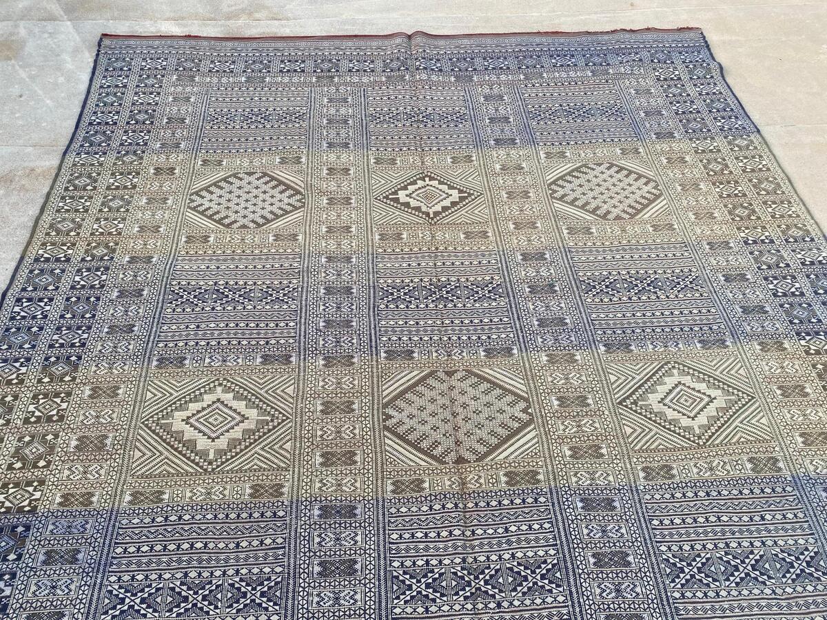The Tiflet rug is a traditional Moroccan flat-weave textile, handcrafted by Berber artisans in the Tiflet region. Renowned for its durability and intricate designs, this rug combines various weaving techniques, including flat weaving, knotting, and embroidery, resulting in a dense, scratch-resistant surface.