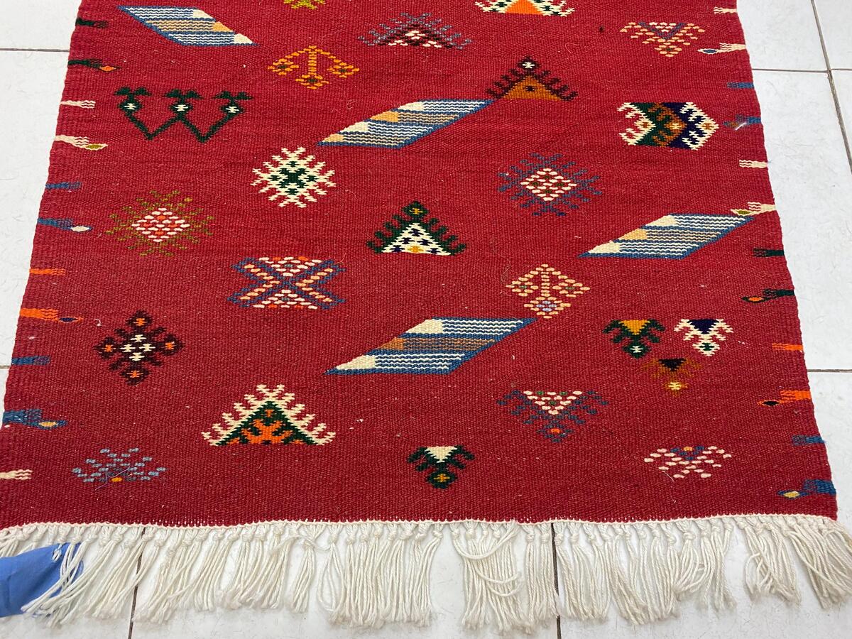 Akhnif designs consist of intricate geometric patterns and motifs, each carrying a symbolic meaning representing themes like family, nature, protection, and celebrations. Warm and vivid colors such as red, orange, and blue give the rug a special charm, accentuating its connection to nature and tradition.