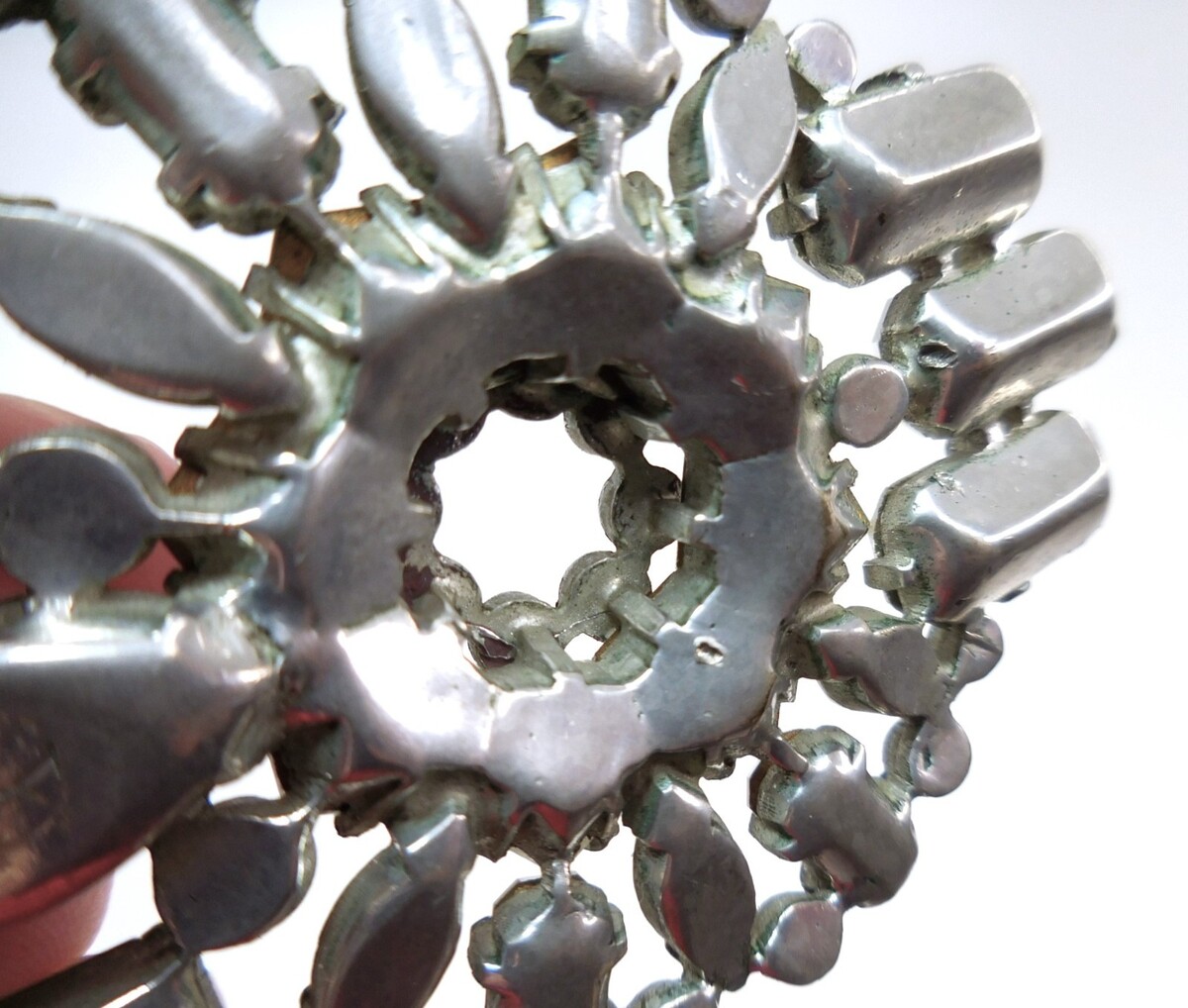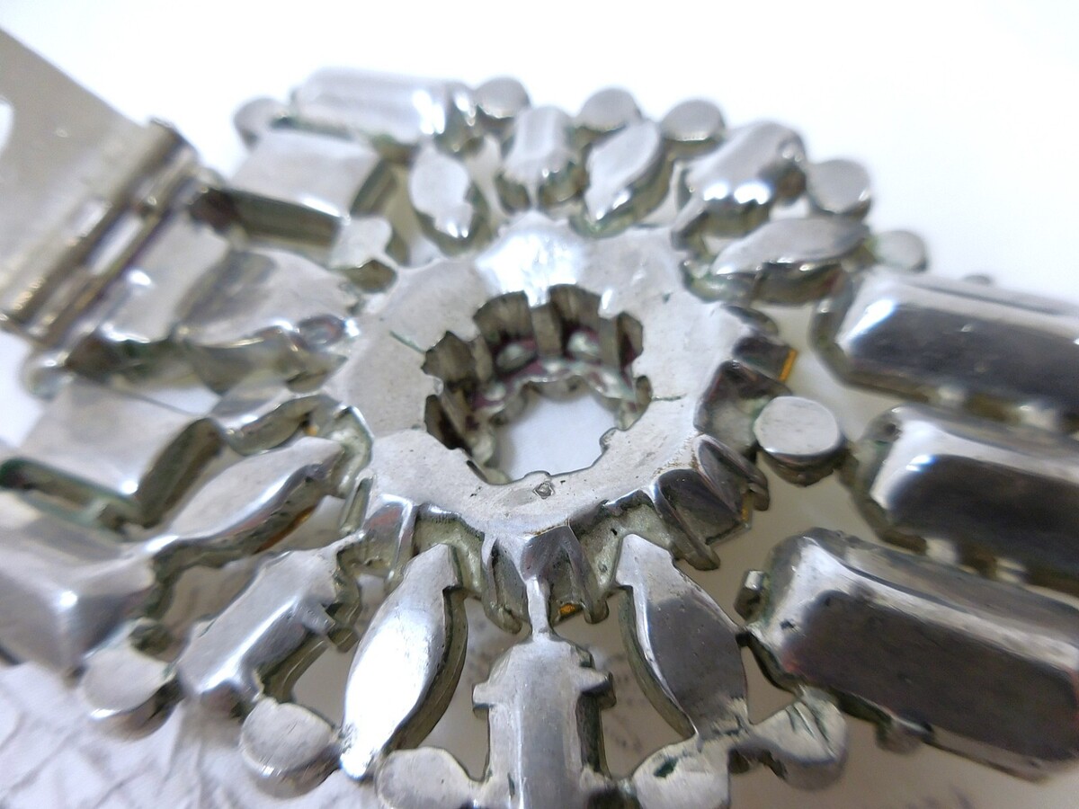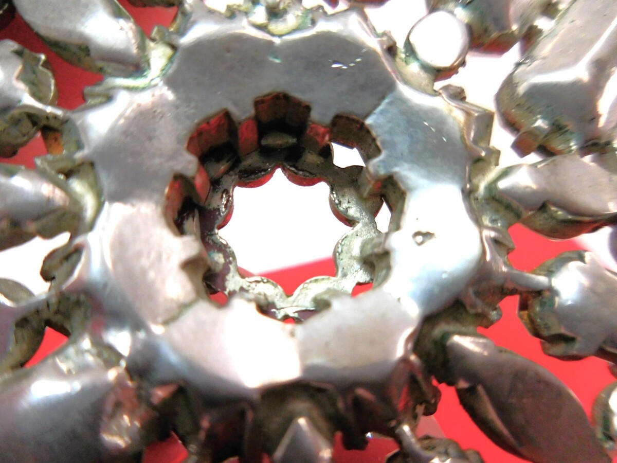 Vintage condition with bright stones and light age?appropriate wear with exception of a few of the small round chaton's. They have a bit of dimness with a bit of verdigris green on the edge but still sparkle nicely and do not deter from its beauty. All stones present and secure.