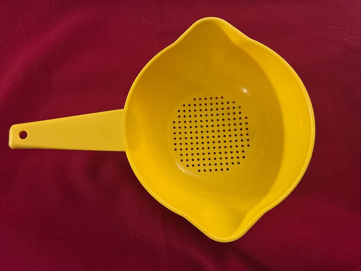 This vintage Tupperware #1200-1 small yellow 1 qt strainer colander with handle is a round, plastic kitchen collectible from the 1960s-1970s. The colander features a single compartment with a capacity of 1 quart, making it ideal for straining and colanding various items in the kitchen. Its compact size and iconic Tupperware brand make it a sought-after piece for collectors of vintage kitchen storage and organization items. With a retro design and original features, this colander is a functional and nostalgic addition to any kitchen.