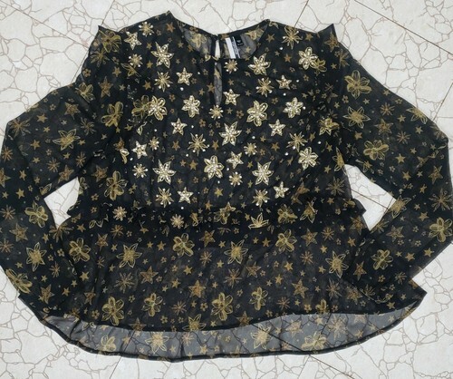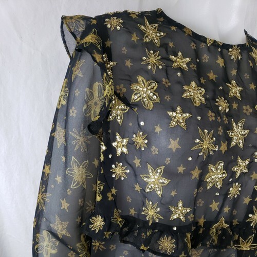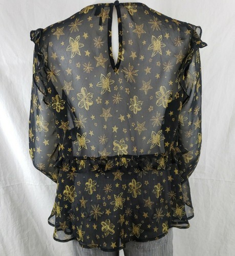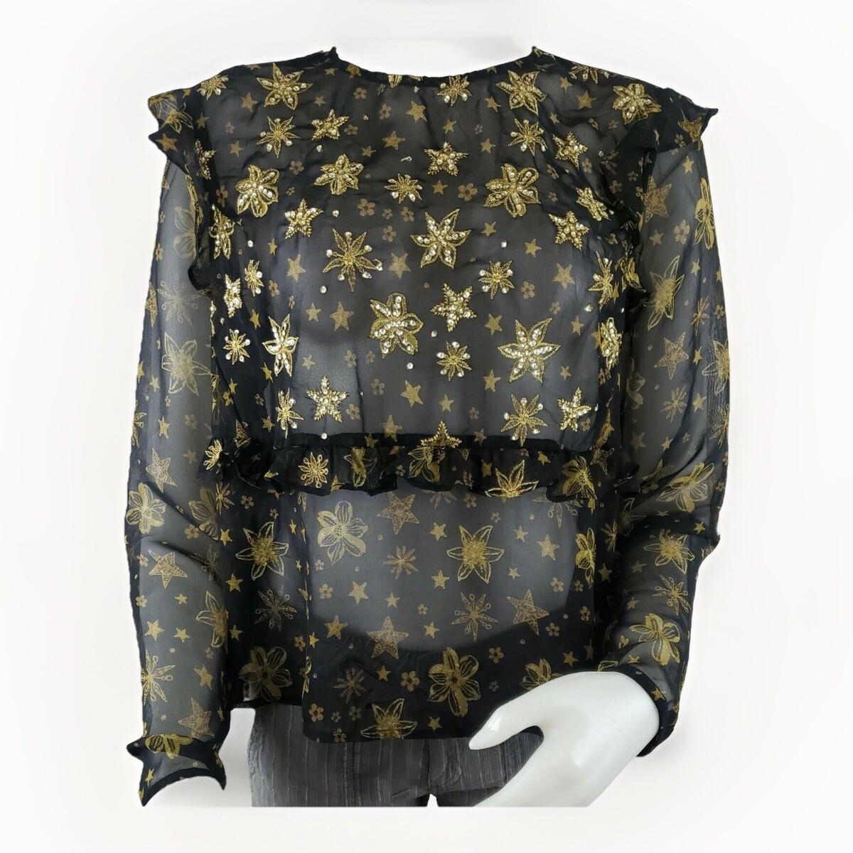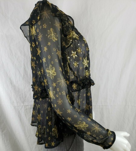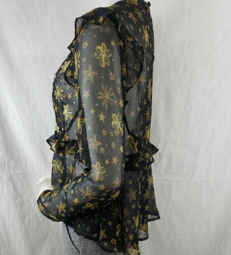 Topshop Idol Blouse Sz 10 Sheer Black Chiffon Ruffles Gold Sequin Long Sleeve