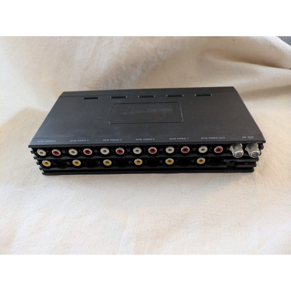 Pelican Accessories System Selector Pro allows for seamless switching between up to five different audio/video sources. Specifically designed for retro gaming enthusiasts, it features dedicated labeled buttons for PlayStation 2, PlayStation, GameCube, Xbox, and Dreamcast. The rear panel includes five sets of AV/S-Video inputs, one AV/S-Video output, and RF antenna connections with a channel 3/4 selector switch. This passive switcher is housed in a sleek black casing that matches the aesthetic of early 2000s gaming consoles. Perfect for organizing multiple classic consoles into a single TV input without the need for constant cable swapping.