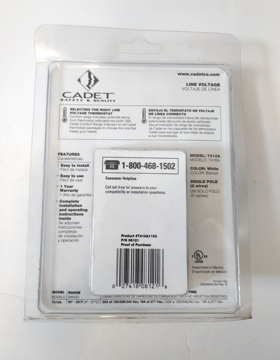 Cadet Manual Thermostat Single Pole Honeywell T410A Part # 08121 -New Sealed