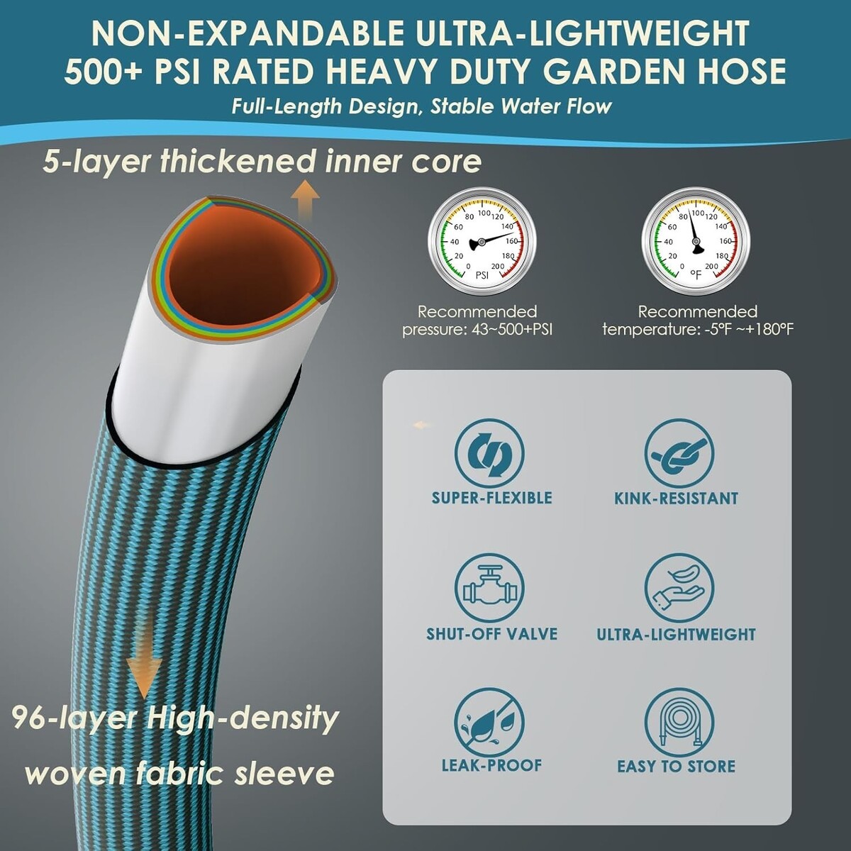 Kink-Free Technology: Engineered with high-density woven fabric and a reinforced 5-layer core that ensures lasting durability. Featuring innovative swivel grip anti-kink technology, simply pressurize the hose and walk forward to make kinks disappear automatically.