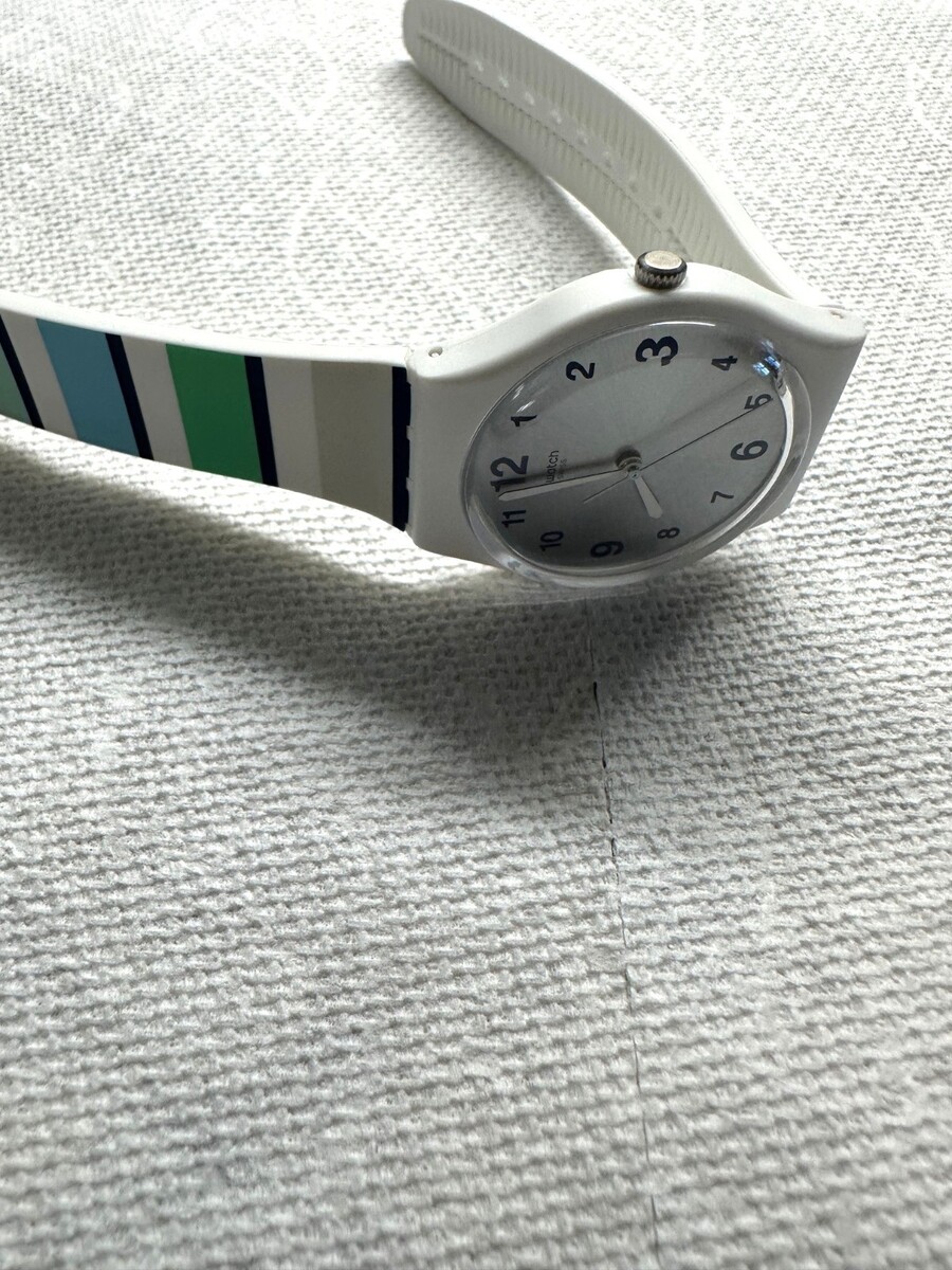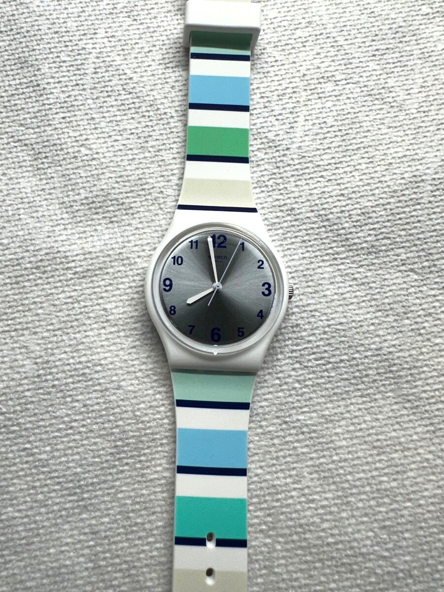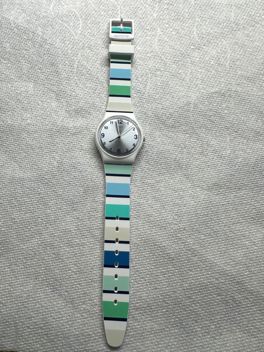 This Swatch timepiece is in fantastic condition in addition to the stunning, vibrant blue and green Patterned Silicone Strap?a wearable reminder of ocean hues. The dial is a gorgeous, sun-brushed silver that catches the light like the sun reflecting off waves, creating a captivating contrast with the colorful band.