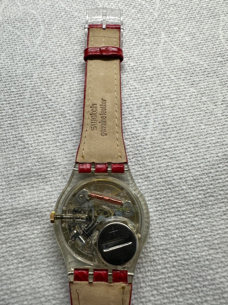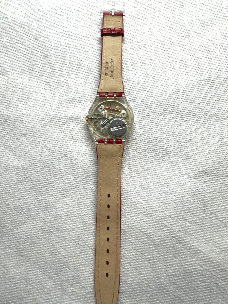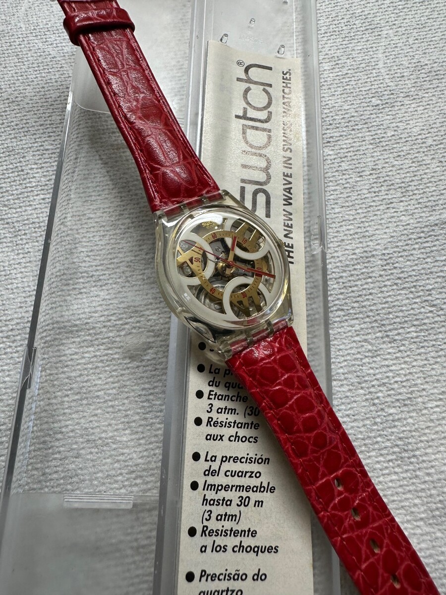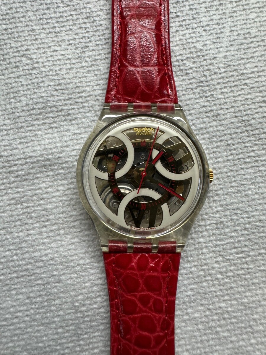The genuine Swatch vivid red crocodile-print leather strap is clean and flexible.