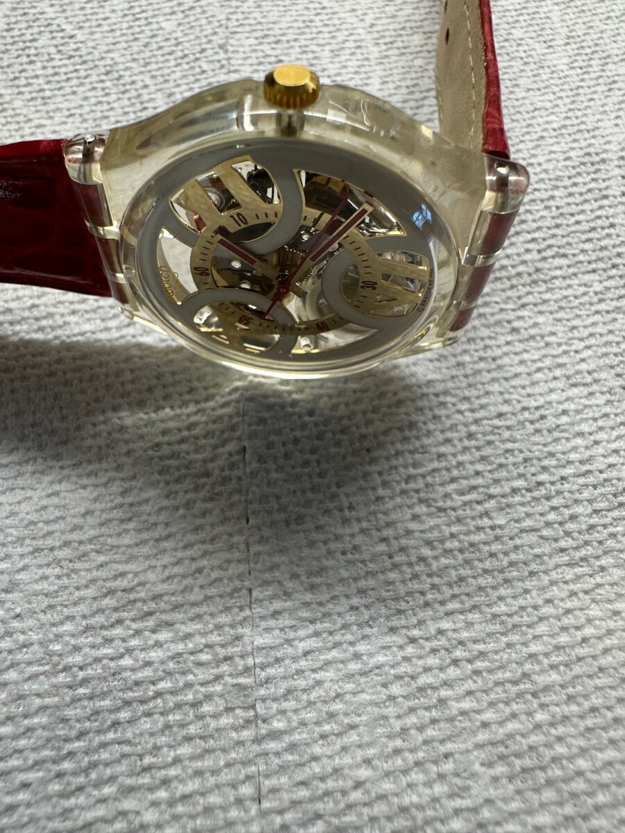 Featuring a striking red leather strap and a bold skeleton dial this a rare, vintage statement piece blending 90's nostalgia with fiery passion.
