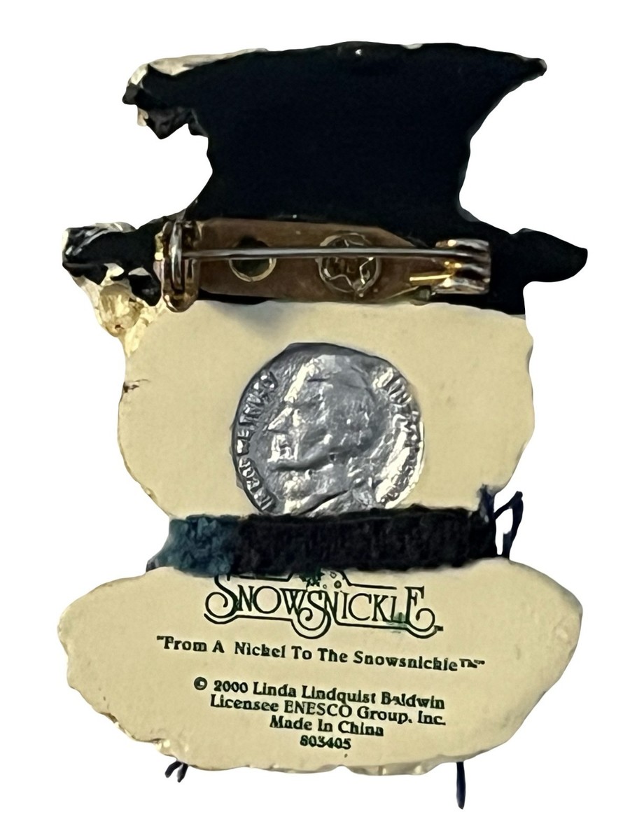 Whimsical brooch set featuring a detailed angel holding a baby alongside a charming snowman character. Part of the Snowsnickle collection by Linda Lindquist Baldwin for Enesco, these pieces have a storybook, collectible feel with soft sculpted details and winter charm. Perfect for holiday wear or collectors of Snowsnickle designs.