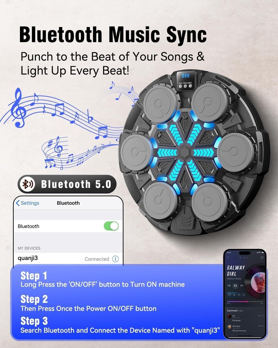 Rhythm Music Integration: Enjoy a unique training experience with Bluetooth connectivity, allowing you to punch along to the rhythm of your favorite songs. The LEDs pulsate with the music, providing instant feedback and motivation.