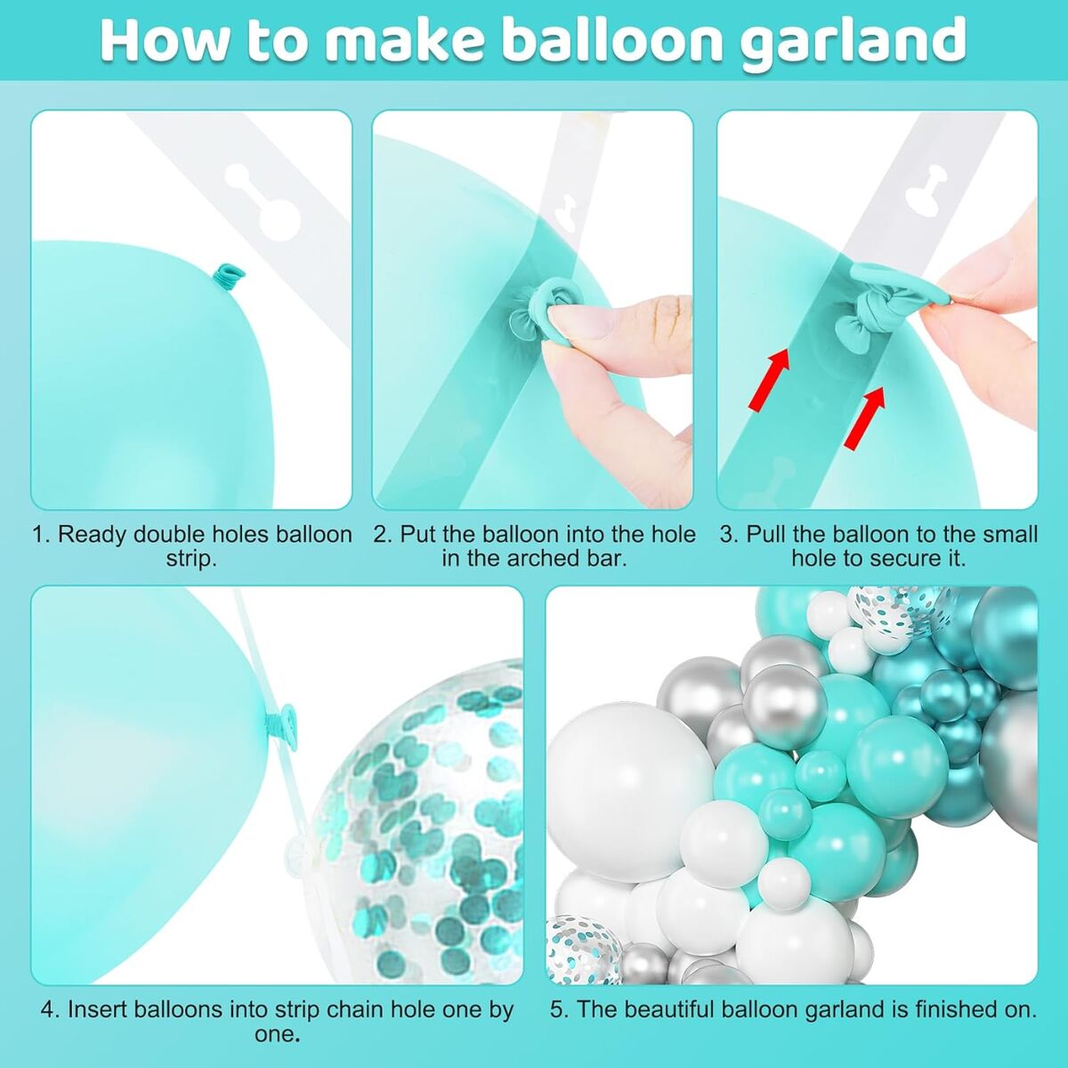 This complete teal balloon garland kit provides everything you need to create a stunning party display: