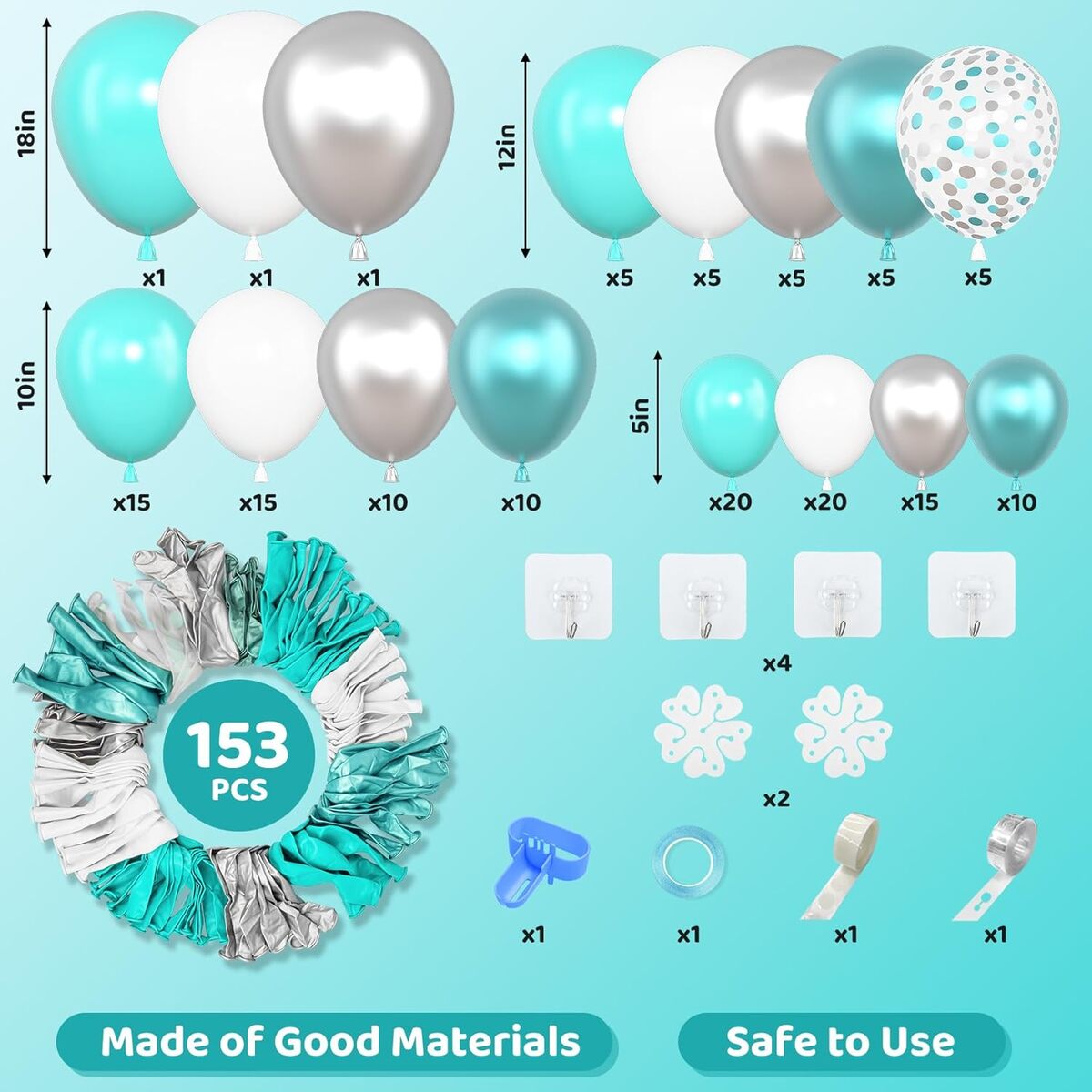 153pcs Teal Balloon Arch Kit Aqua Blue Silver Party Decor