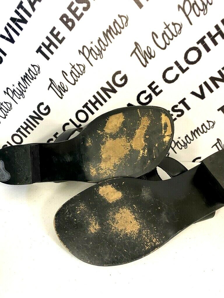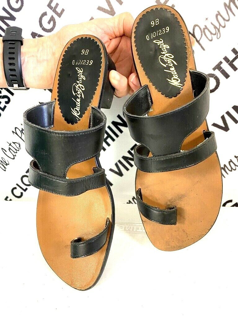 Vtg 70s Womens Black Leather Toe Sandals Made in Brazil Black 9 B