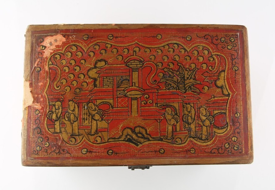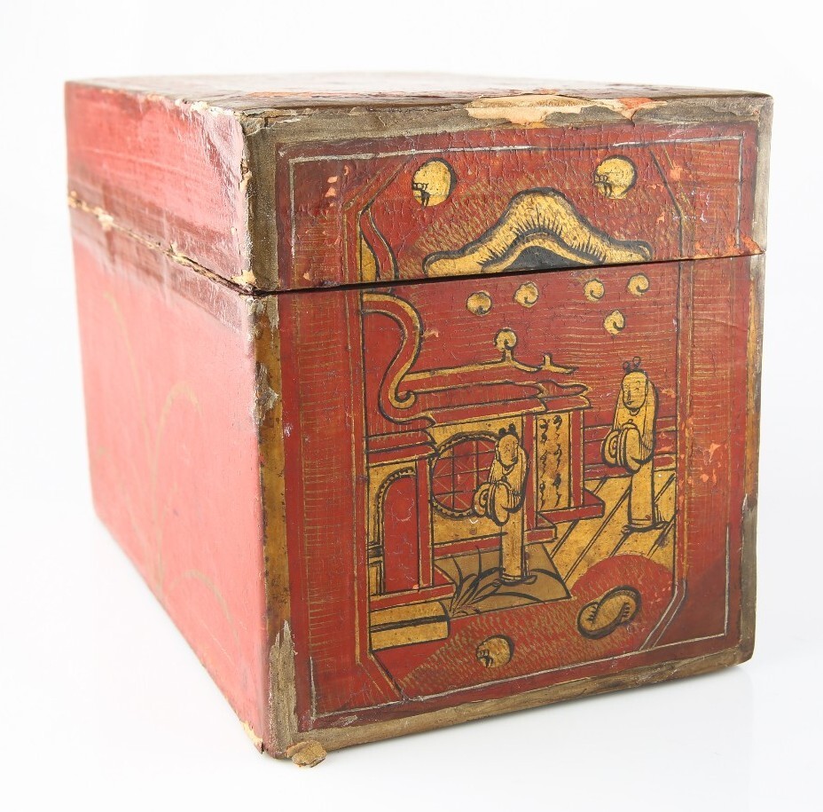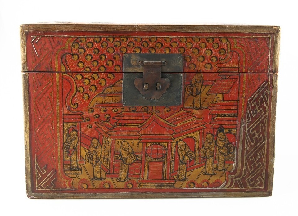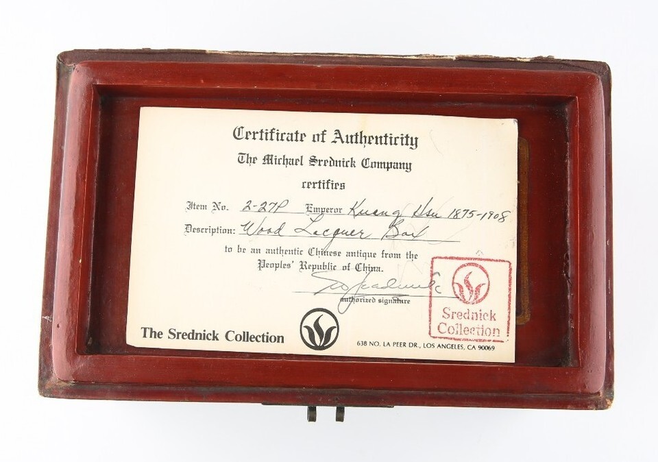 Antique Chinese Red & Gold Lacquer Wooden Box Hand-Painted Qing Dynasty w/ CoA