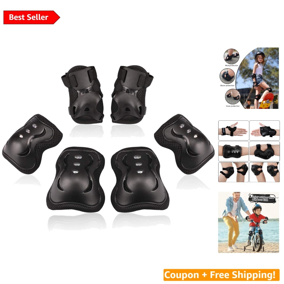 Invest in your child's safety without compromising comfort! Our set of knee and elbow pads combined with wrist guards ensure that your young athletes stay protected while enjoying their favorite sports. With adjustable sizing and ventilation for breathability, your children can focus on having fun with peace of mind.