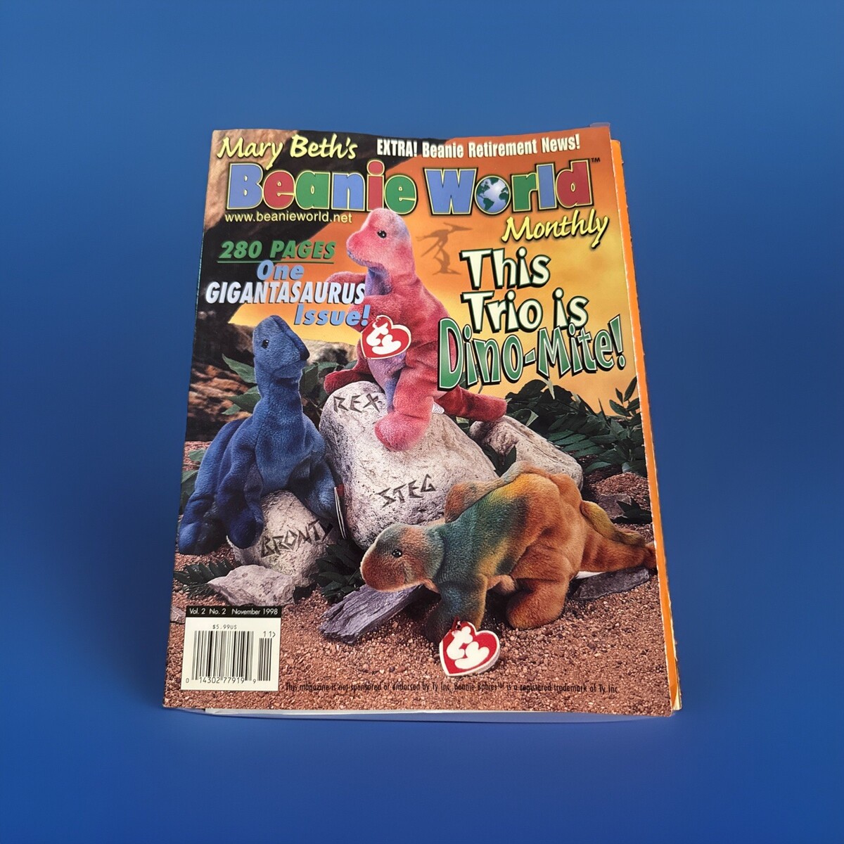 Mary Beth's Beanie World Monthly Vol. 2 No. 2 November 1998 Dino Issue TY is a vintage magazine focused on Ty Beanie Babies, specifically featuring dinosaur-themed plush toys. This issue likely includes articles, photos, and information on various dinosaur-themed Beanie Babies released in November 1998. It serves as a collectible item for fans and collectors of these nostalgic toys, offering a snapshot of the popular trends and releases from that time period.