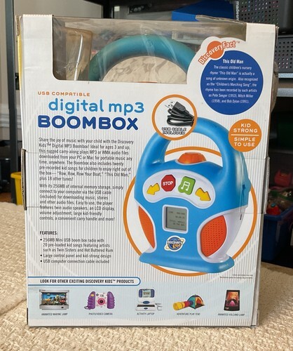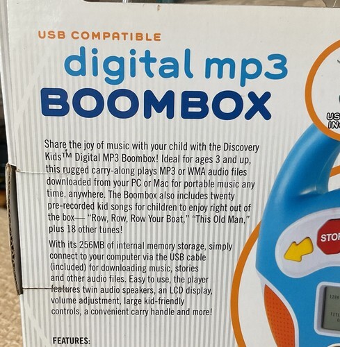 IMPORTANT TO NOTE: This listing is for a brand-new Discovery Kids Little Tunes Kid Tough Player Digital MP3 Boombox. Listing includes the original packaging. The packaging (box) has been opened though. Both the box and MP3 Boombox have some sun damage. Make sure you understand this - as the listing is Sold "As Is." No returns and/or refunds. PLEASE REFER TO THE INCLUDED PICTURES IN ORDER TO UNDERSTAND EXACTLY WHAT YOU WILL BE PURCHASING.