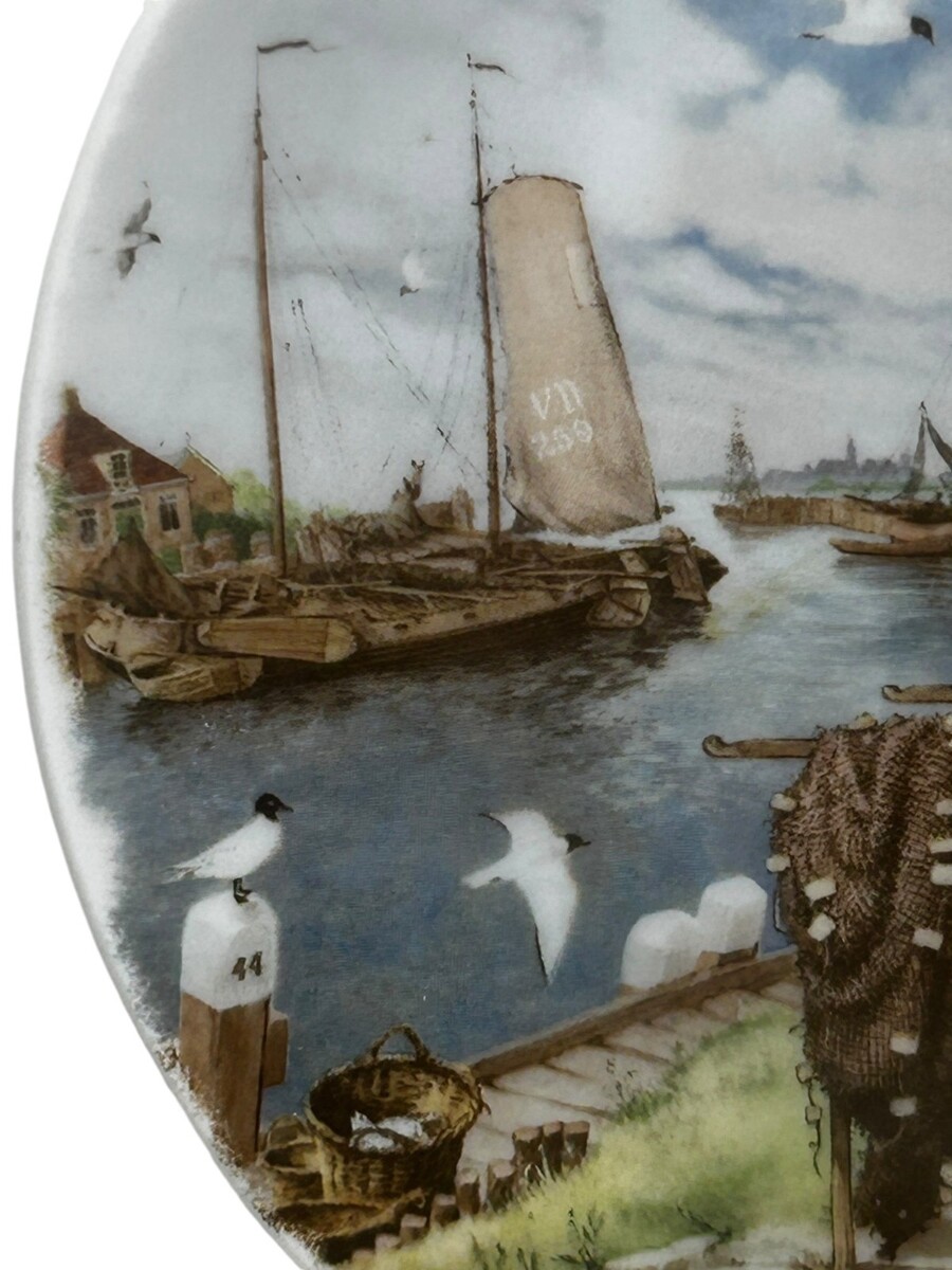 ? Design: Traditional Dutch harbor scene featuring a fisherman repairing nets, a young girl in traditional dress, and sailing vessels (VD 259)