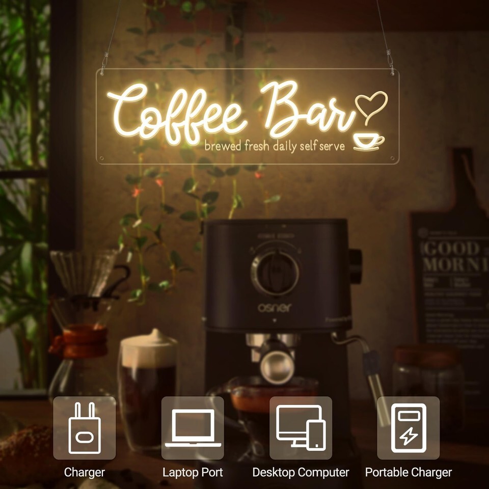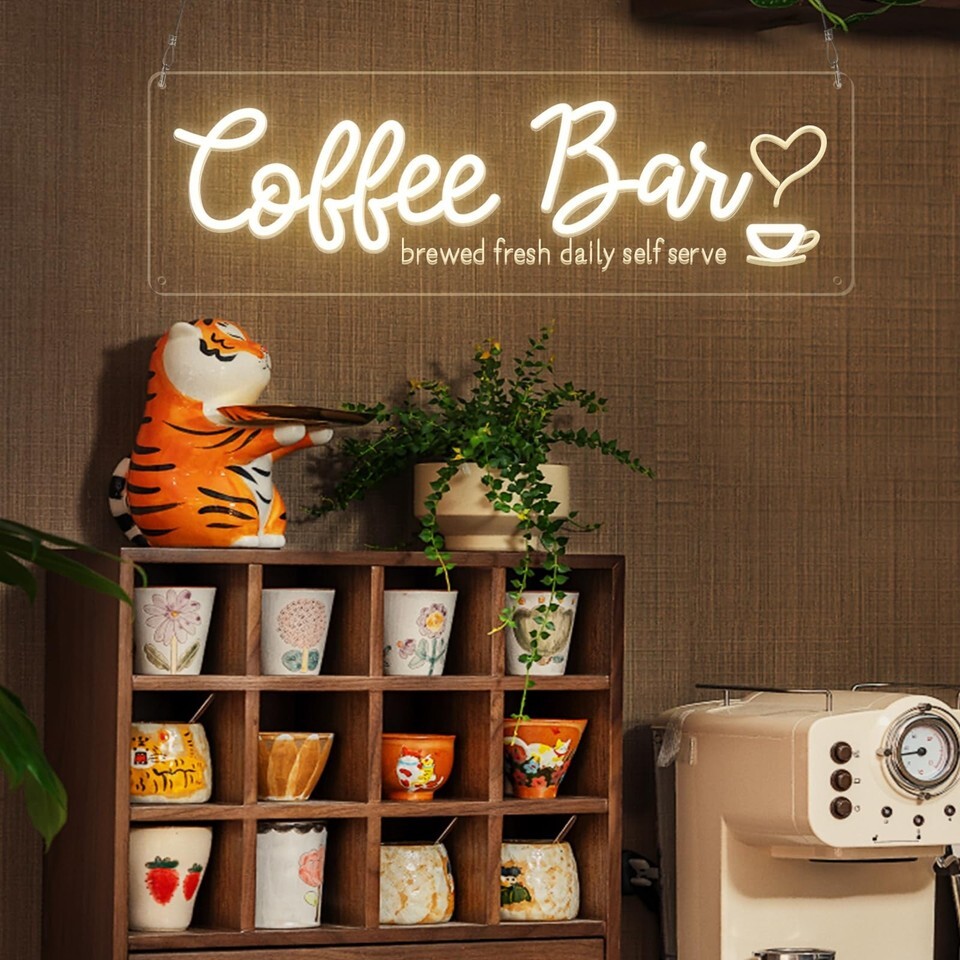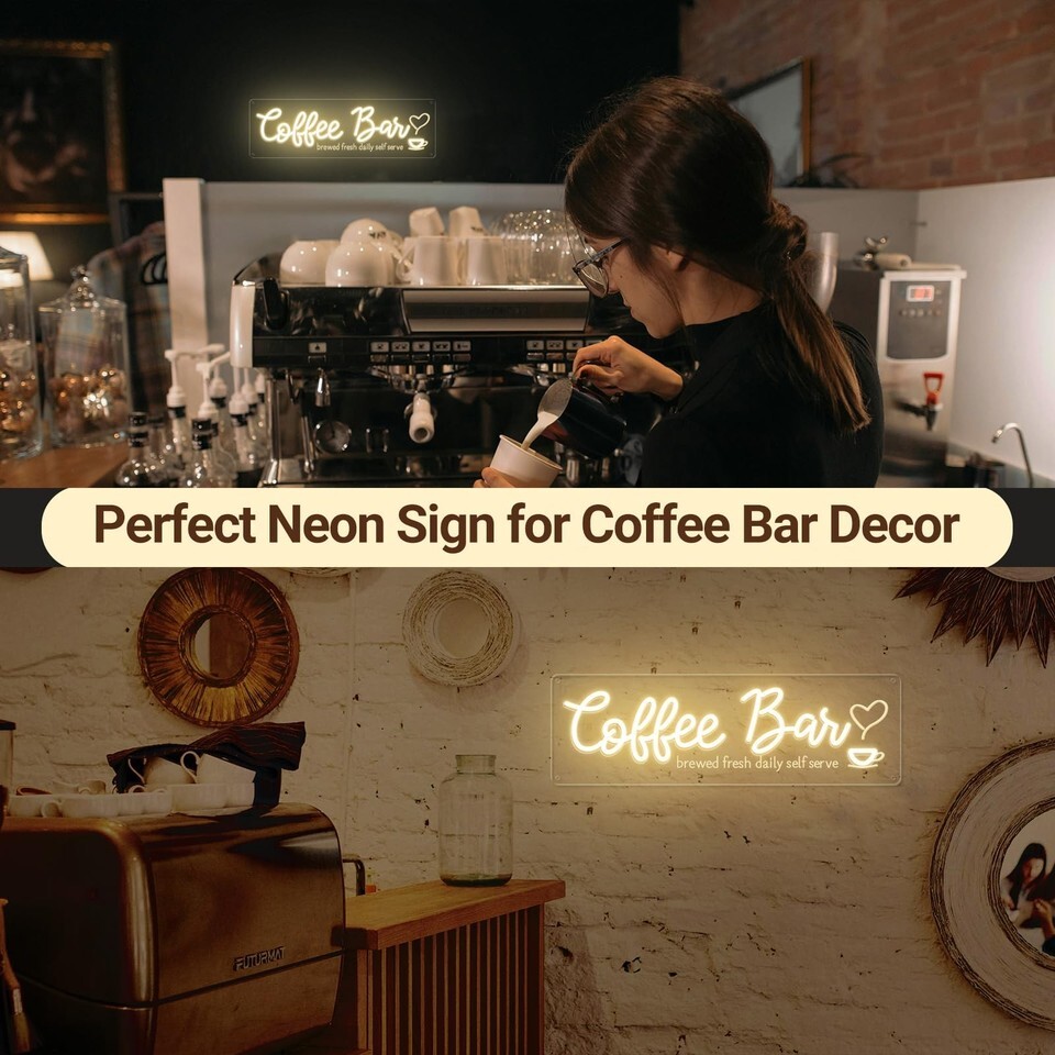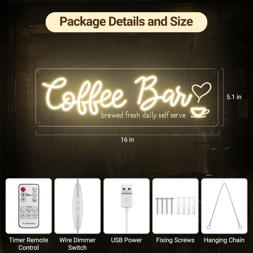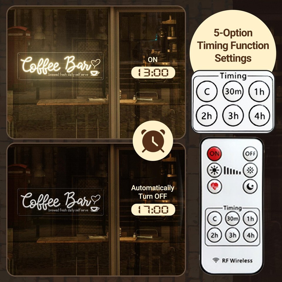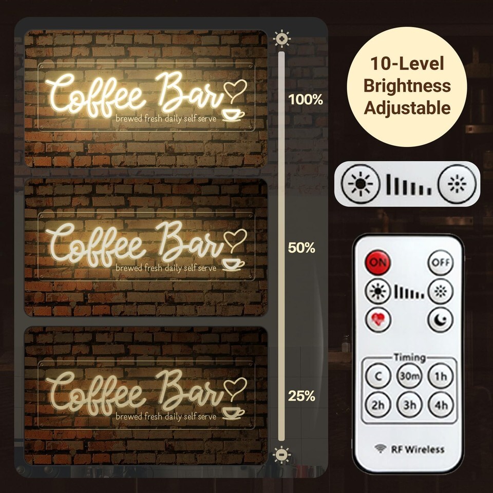 Coffee Bar Neon Sign w/ Timer, Remote Dimmer, Warm White LED Coffee Light