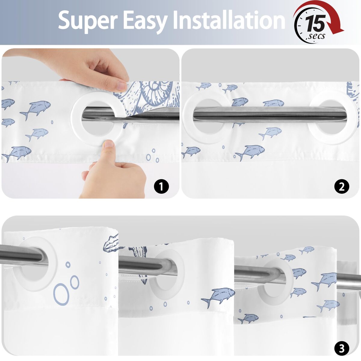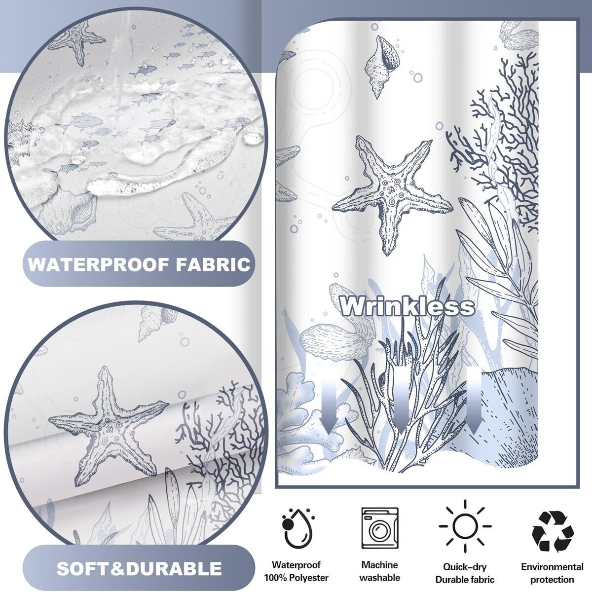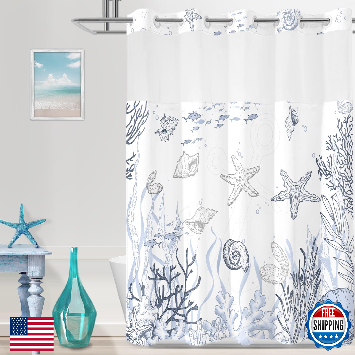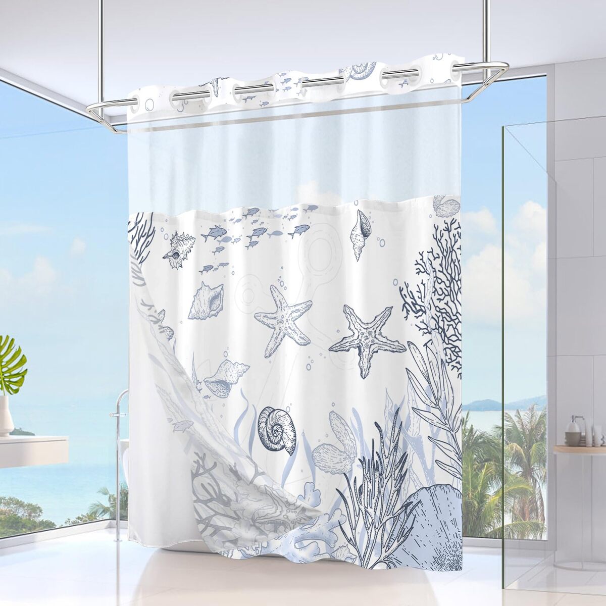 ?Easy No-Hook Installation Split Ring Design?Snap the curtain directly onto any standard shower rod in seconds?no tools, hooks, or rod removal needed. Our patented split ring system ensures a smooth, silent glide for a cleaner, modern bathroom update immediately.,?Removable Snap-in Waterproof Liner?The attached fabric liner creates a reliable water barrier. Detach it in seconds via sturdy snaps for separate cleaning?no need to take down the entire curtain. Two bottom magnets secure the liner against splashes.,?VIBRANT COASTAL BEACH DESIGN? Transform your bathroom into a serene seaside retreat. Featuring high-definition printing of starfish, seashells, and coral, this nautical theme adds a refreshing coastal vibe to your decor. The premium lightweight polyester fabric stays crisp and wrinkle-free.,?AIRY MESH TOP VIEWING WINDOW?The translucent upper mesh panel allows natural light in and promotes air circulation for faster drying, all while maintaining complete privacy. This design reduces moisture buildup more effectively than solid curtains.,?QUICK-DRY EASY MAINTENANCE? Crafted from high-density, lightweight polyester specifically engineered for fast drying and durability. Both the outer ocean curtain and snap-in liner are machine washable on a gentle cycle. Simply tumble dry on low to keep colors vibrant and fresh.