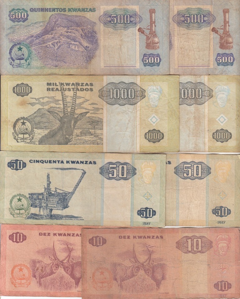 Angola, (Lot of 8) 10, 50, 500, 1000, Kwanzas, Old Issue, Mixed Collection