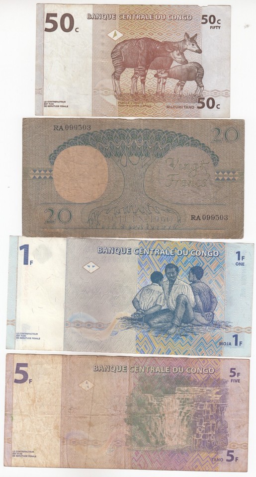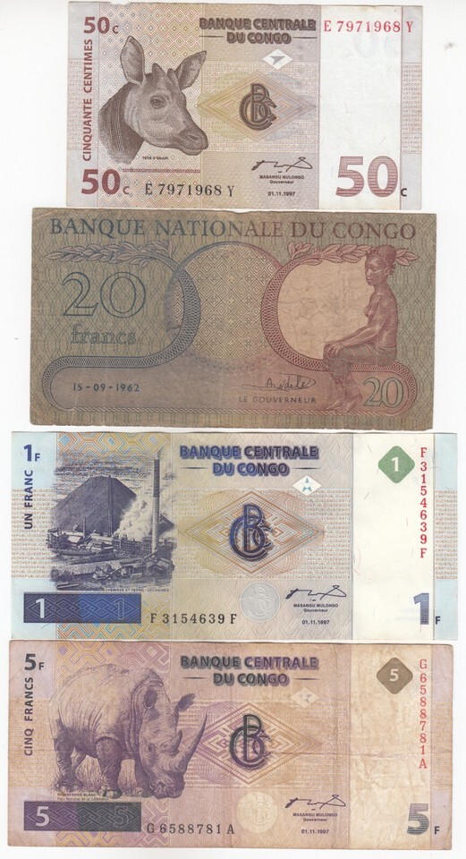 Congo, 1, 5, 20 Francs, Y 50c, National Bank and 50 similar items