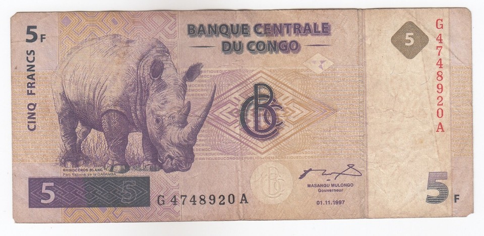 Congo 5 Francs Note, 1997, (01/11/1997) Sn: G4748920A, Rhino, P86, VF, Rare- ...