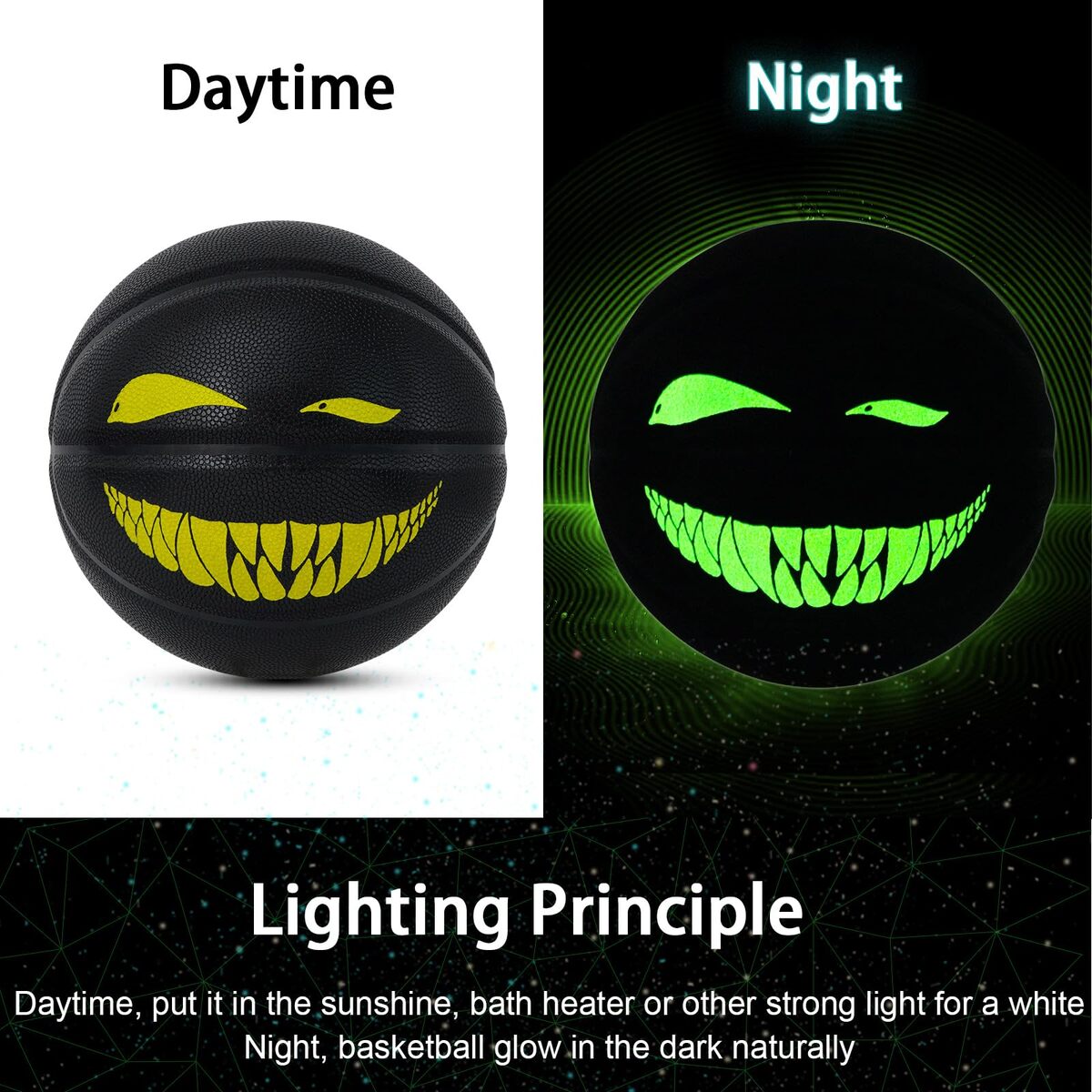 Official Size 7 for Men Advanced Players: Full-sized fun for everyone. This is an official size 7 (29.5-inch) basketball, the standard for men's play. It?s ideal for teens and adults who want to add a unique flair to their game, practice their skills, or just have a blast with friends,Hygroscopic PU Leather Provide Excellent Grip: Kuangmi luminous basketball is made of premium composite PU leather with 100% nylon windings and flexible butyl bladder to maintain a good bounciness and shape retention,provides ultimate grip control,No Need Battery:The surface of this basketball is covered by new light-absorbing leather,it needs to absorb the light to glow in the dark.Only put it in the sunshine,bath heater or other strong light for a while,stronger and longer light will make the basketball glow brighter and longer(NOTE:IS NOT THE LED BALL),Perfect for Night Basketball Activities: Kuangmi night basketball can glow in the dark with a clear bright green light, perfect for street night basketball activities, don't let darkness become an obstacle to your training,Indoor Outdoor Durability: Ready for any adventure. The tough PU material and secure construction ensure this fun ball can withstand regular use on concrete, asphalt, or hardwood floors. The vibrant print is designed to last, so the fun doesn?t fade away