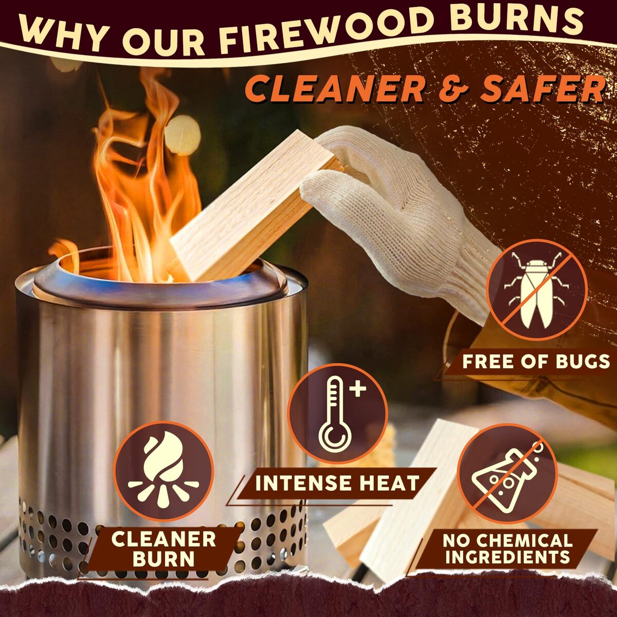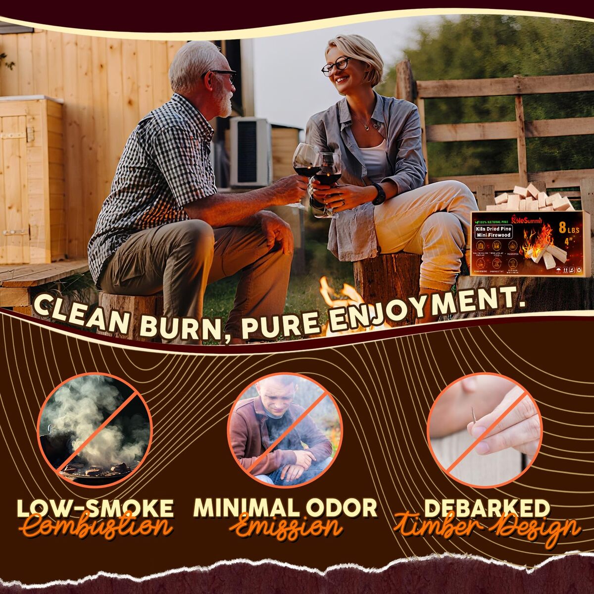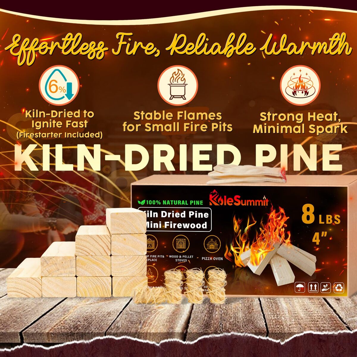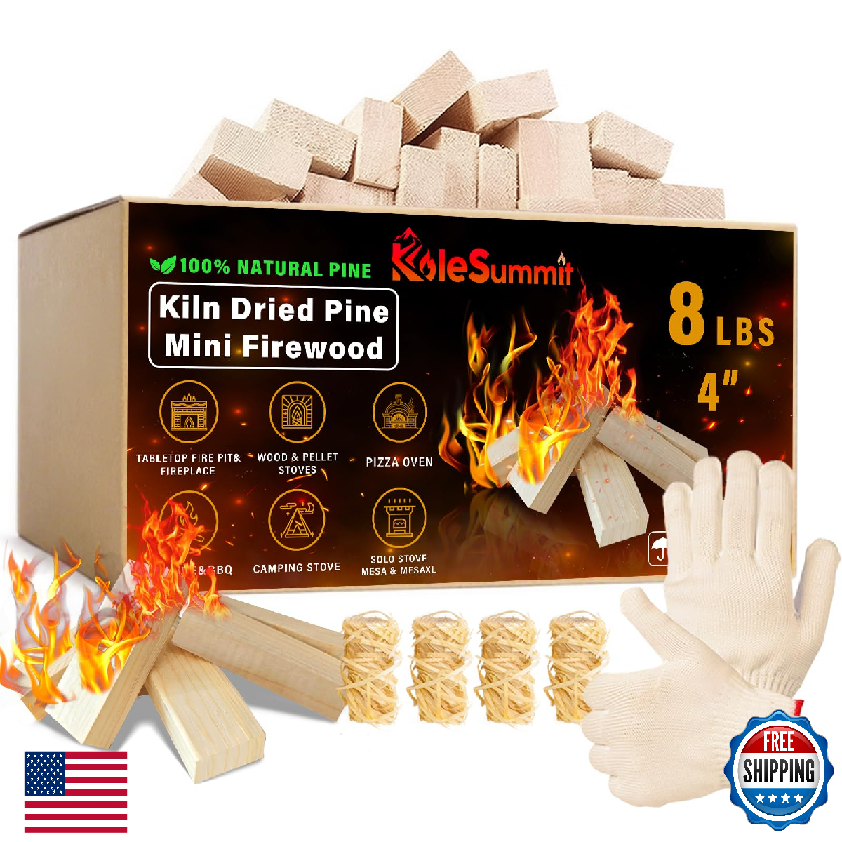 Premium Kiln Dried Pine Mini Fire Sticks: Crafted from natural, bark-free premium pine, our kiln dried mini firewood sticks (under 6% moisture) ensure a clean, efficient burn with maximum heat output, making them superior firewood.,Low Smoke Long Burning Clean Fuel: Experience significantly reduced smoke and sparks. Our small barkless kindling logs burn cleaner, hotter, and last longer, providing reliable warmth and ambiance safely.,Perfectly Sized Fire Pit Accessories: Each 4-inch Mini Fire Stick fits effortlessly. Our compact 8 lb box (643 cu in) is easy to store and carry. Instantly fuel your tabletop fire pit, Solo Stove Accessories Mesa, Pizza Oven, or BBQ Grill.,Pure Wood Flavor Easy, Safe Ignition: Enjoy a chemical-free aroma from real pine wood. Easy ignition with included fire starters. Gloves protect hands from wood splinters when handling. Ideal for creating ambiance during gatherings.,Your Satisfaction, Our Priority: Rest easy knowing we are dedicated to your complete satisfaction. Experience our responsive support and commitment to ensuring your Mini Fire Stick journey is smooth and worry-free.
