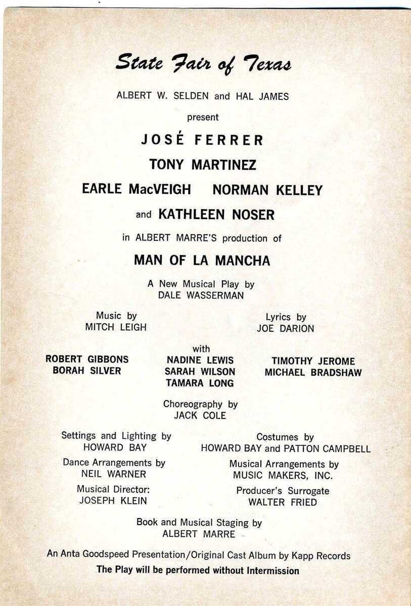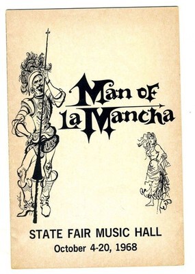 A Program for Man of La Mancha from a performance in 1968 at the State Fair Music Hall in Dallas Texas. In very good condition. Starring Jose Ferrer. With Tony Martinez, Earle MacVeigh, Norman Kelley and Kathleen Noser.