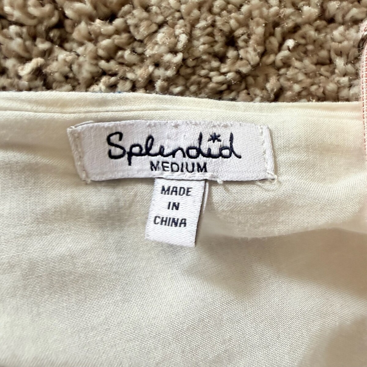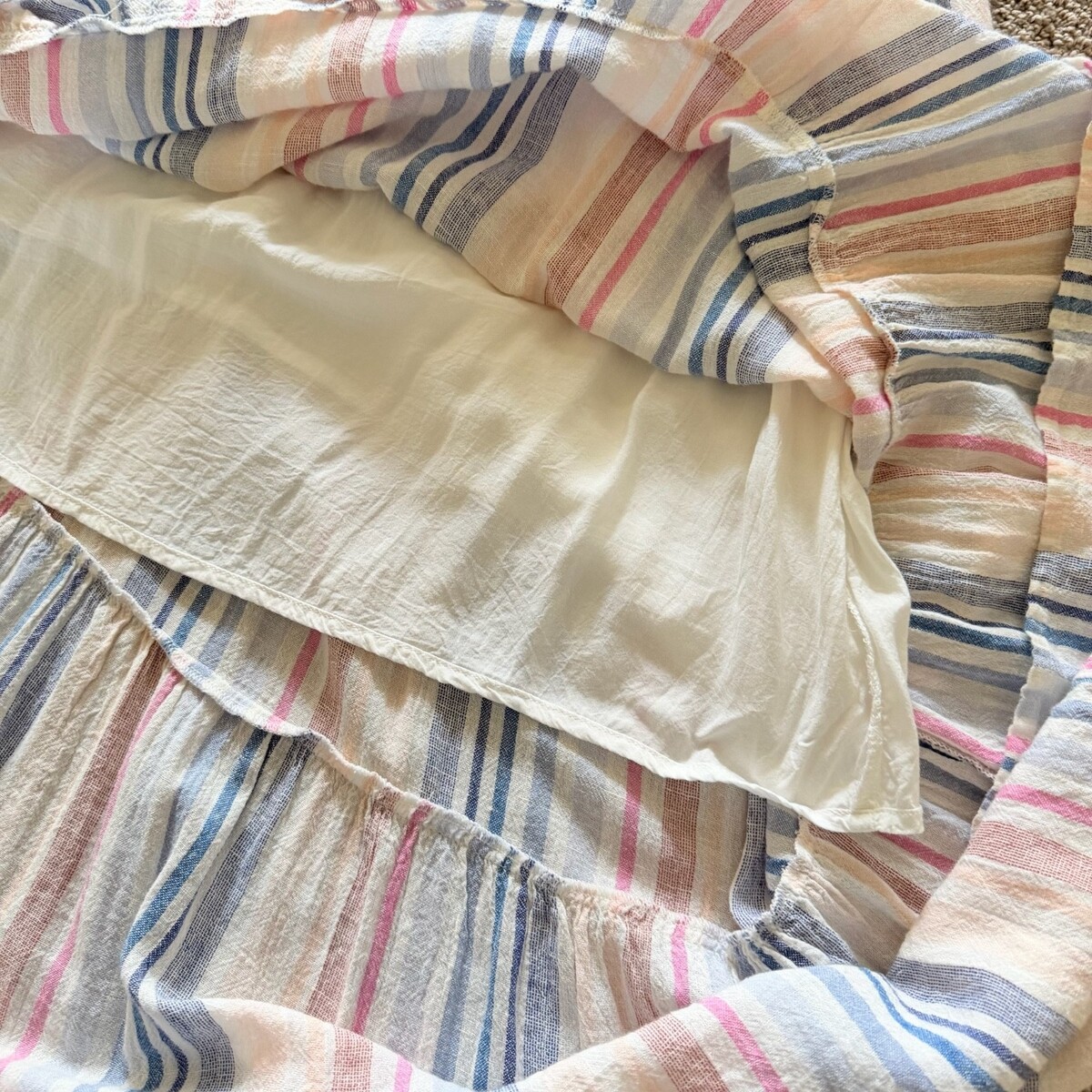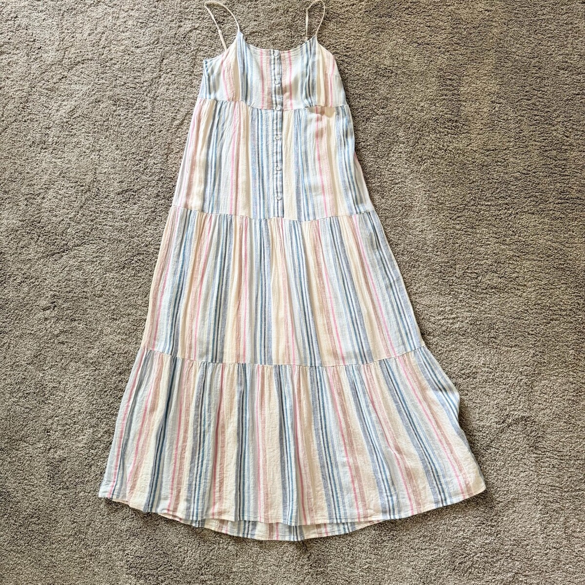 Condition: Pre-owned in good condition. There are some pulls where the tiers meet. It is double-stitched, so it's not a hole. This has only been dry-cleaned. There are no stains. The material is linen and it is very cooling to wear.