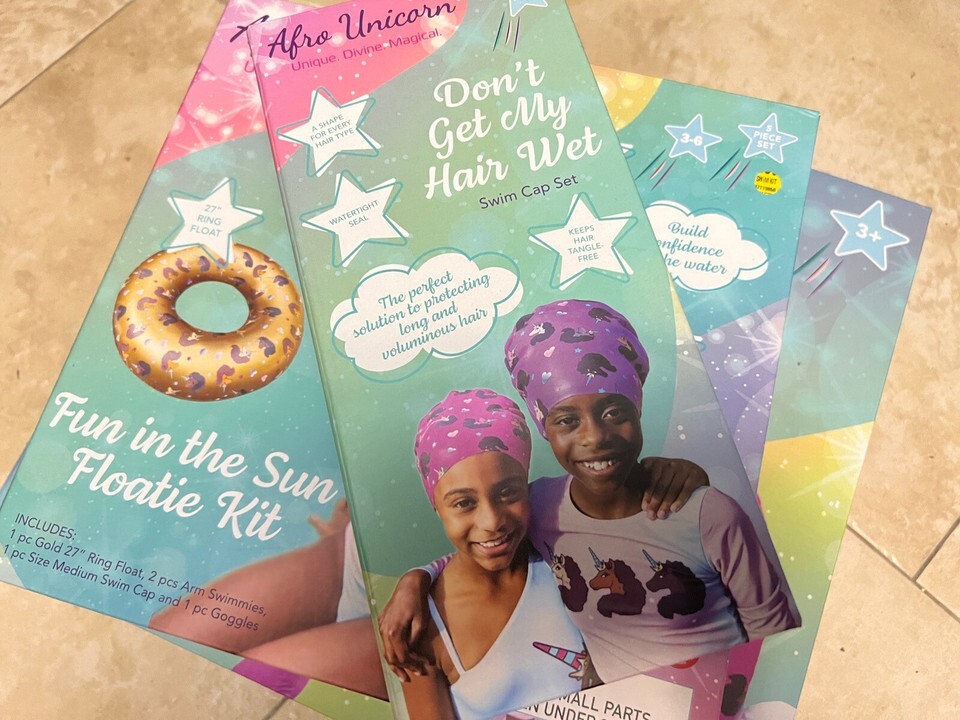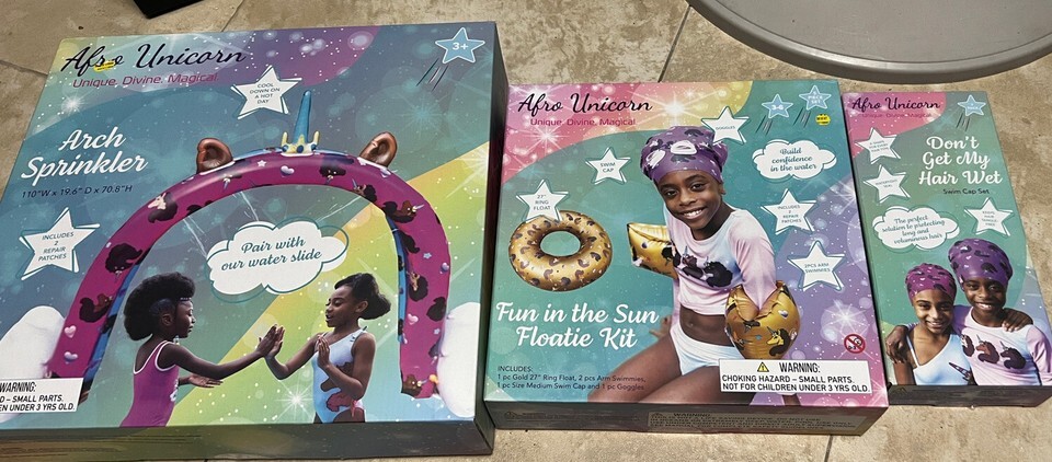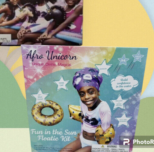 3 Pack Afro Unicorn Split ring & Floatie Kit Arm Float Swim + 2 hair Cap