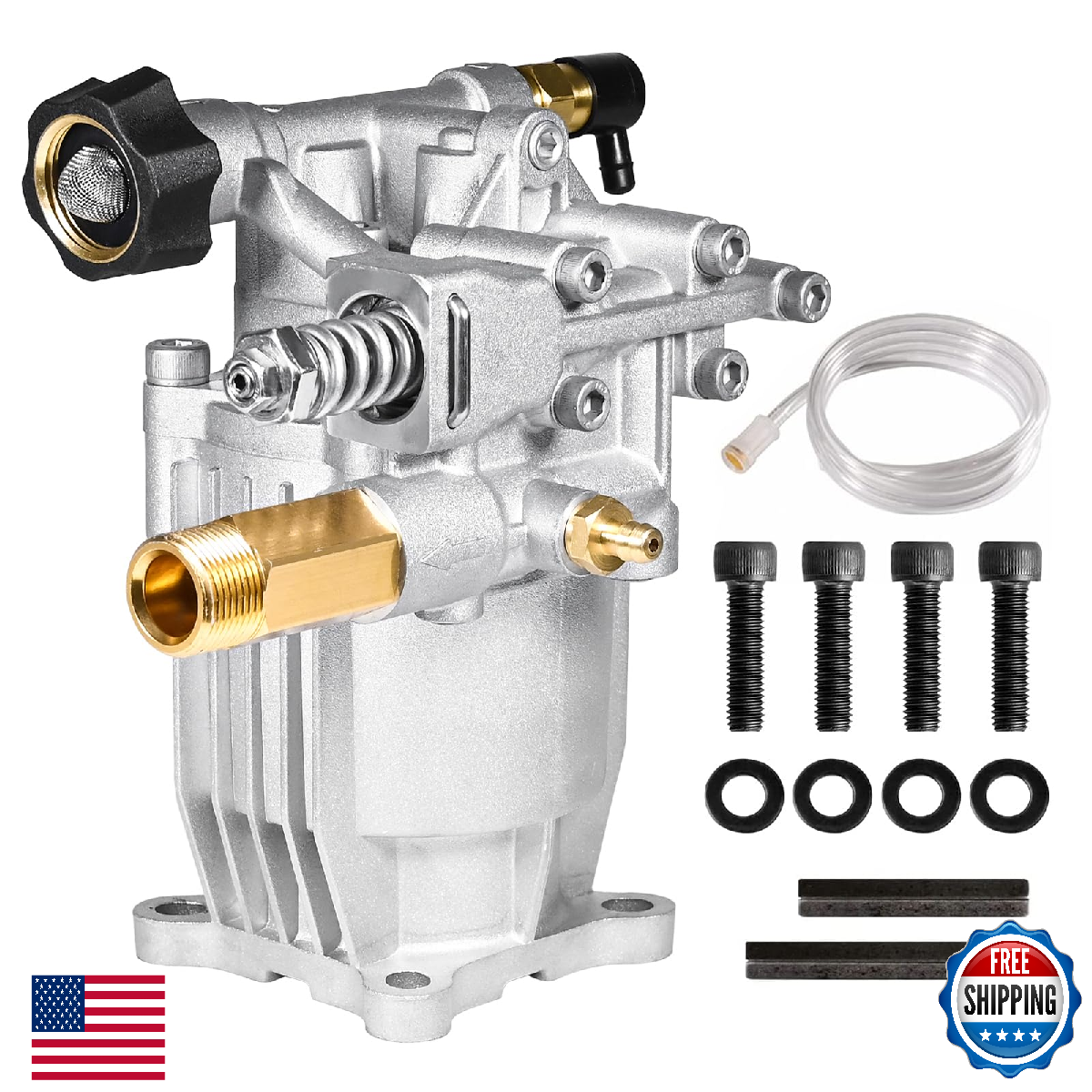 ?Extend Service Life High Performance?Replace this HORIZONTAL 3/4" shaft pump to reborn engine instead of buying a whole new power washer, and produce up to 3400 PSI at 2.5 GPM. Easy-to-install kit for quick start, stainless steel pistons for improved seal life and features a stainless-steel integrated unloader with easy-start system, ideal for washing walls, sidewalks, vehicles and more. *Not for 7/8" pumps, SRMW footprints, or frames with shrouds blocking the mount.,?Fit Guidance (Horizontal, 3/4" Shaft)?SAE standard bolt pattern for many gas pressure washers with horizontal engines, great replacement for ?HONDA GC190, GC160 (with 3/4" keyway shaft), GX160. ?SIMPSON: MSH3125 MS60753, MS60788, MS60850, MS60799,MS61043. ?Homelite 308418007, 309515003, 308418004, 308653078, 308653057, UT80522B, UT80953B, UT80522A, UT80953A. ?Karcher: G3050OH, K2400HH, G2400HH. ?mv 2.5g30 ?Troy-Bilt: 020241, 020241-1, 20242.,?TRV Protection Adjustable Unloader?The TRV helps protect the pump from overheating in bypass. A double-seal system and upgraded piston/bearing design target longer service life Max 150 hours, longer than original power washer pump. With adjustable unloader allows you to increase or reduce the pressure to fit the engine's requirements better.,?Fit for Who?USA Standard Mounting design, this pump could fit most brand gas power washers come with the small gas engine from 180 to 225 cc (Equivale 6.5 to 7 hp engine). * Please match engine orientation, PSI/GPM, 3/4" shaft, and inlet/outlet orientation for a proper fit.,?Easy Start Easy Job?Pre-filled oil (no initial oil change required) and an Easy-Start structure provide easier pull-back starting. Use it for years with your pressure washer accessories. * Recommend draining out water inside pump and use pump protectant before long-time storage.