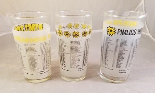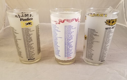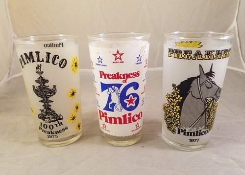 A vendre, un lot de 8 verres a collectionner Preakness Stakes en tres bon etat. Les verres ne presentent ni eclats ni feles. Le lot de 8 verres comprend les annees 1975 - 1982, 1975, 1976, 1977, 1978, 1979, 1980, 1981, 1982.