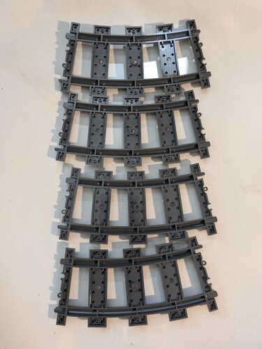 A vendre est un lot d'occasion de 4 Lego Curved Plastic Rail Road Train Track City Remplacement 53400 Gris.