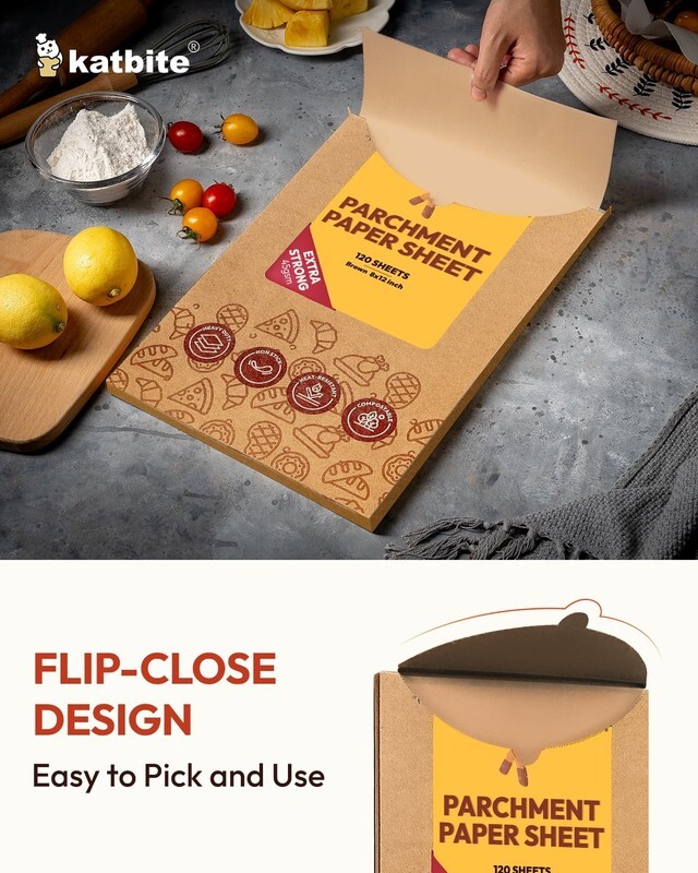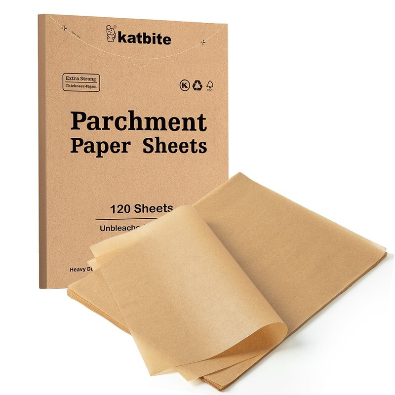 The Katbite Parchment Paper Sheets come in a pack of 120 and measure 8x12 inches. They are made from 100% pure wood pulp and coated with food-grade silicone on both sides for a non-stick surface. These sheets are 12% thicker than regular parchment paper, with a weight of 45GSM. They can withstand temperatures from -68 to 450 degrees Fahrenheit.